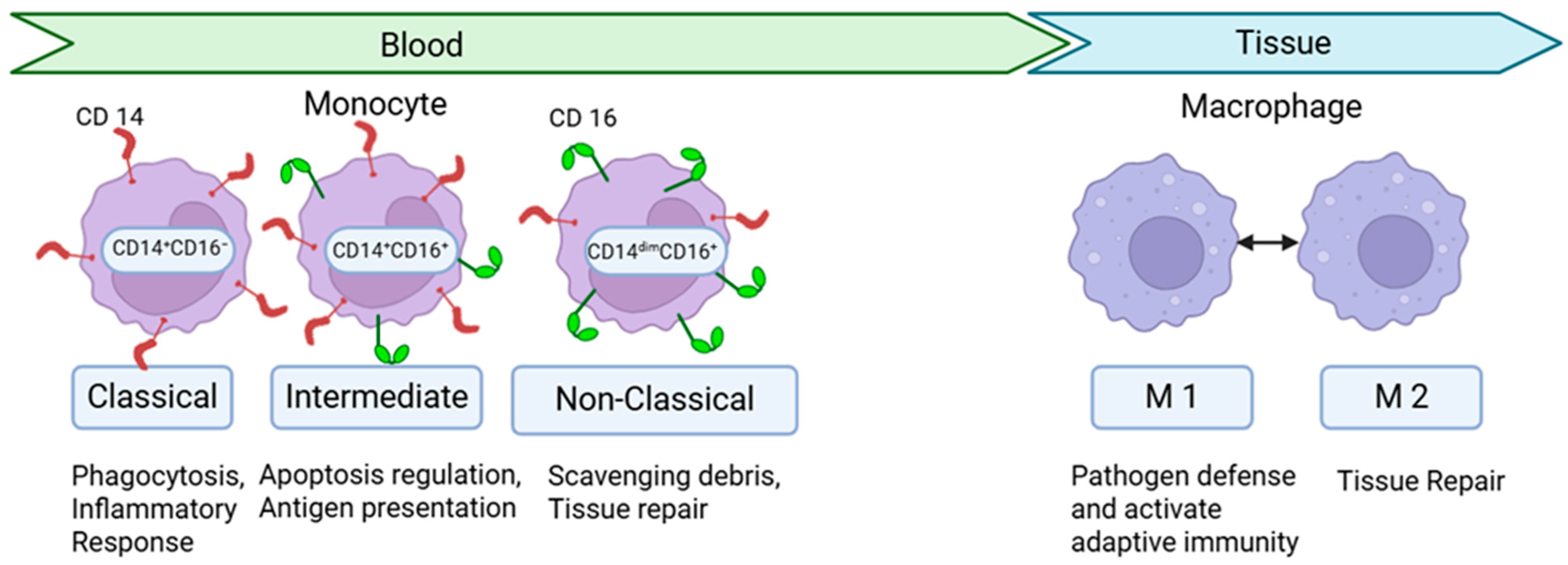 - Kapellos, T.S.; Bonaguro, L.; Gemünd, I.; Reusch, N.; Saglam, A.; Hinkley, E.R.; Schultze, J.L. Human Monocyte Subsets and Phenotypes in Major Chronic Inflammatory Diseases. Front. Immunol. 2019, 10, 2035. [Google Scholar] [CrossRef]