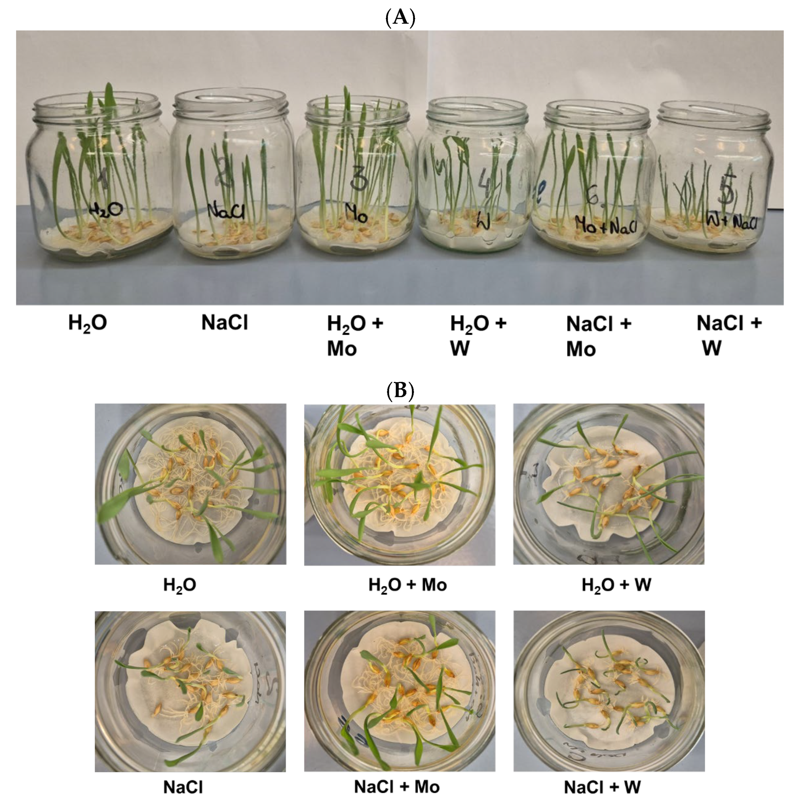 - Batyrshina, Z.; Yergaliyev, T.M.; Nurbekova, Z.; Moldakimova, N.A.; Masalimov, Z.K.; Sagi, M.; Omarov, R.T. Differential influence of molybdenum and tungsten on the growth of barley seedlings and the activity of aldehyde oxidase under salinity. J. Plant Physiol. 2018, 228, 189–196. [Google Scholar] [CrossRef]