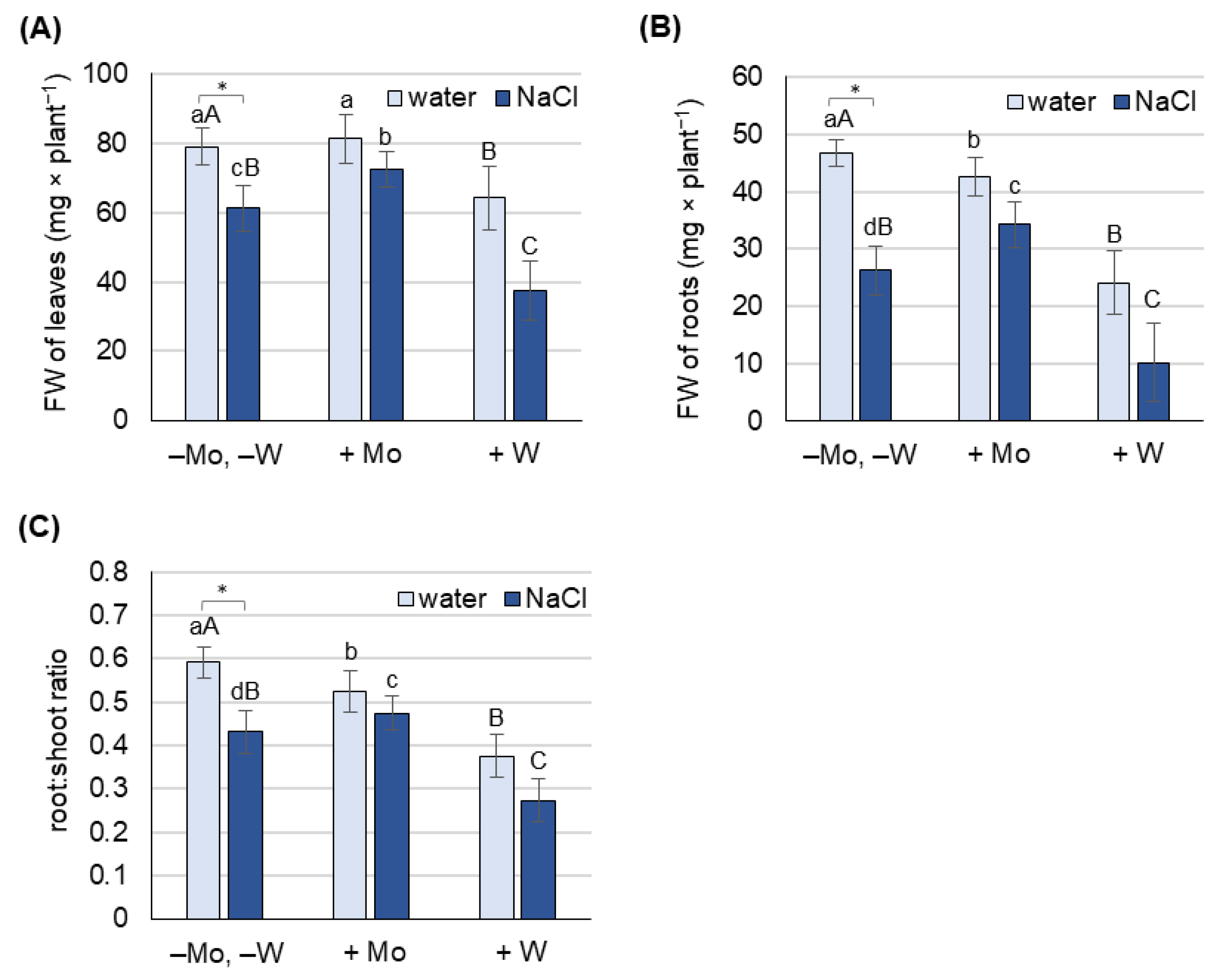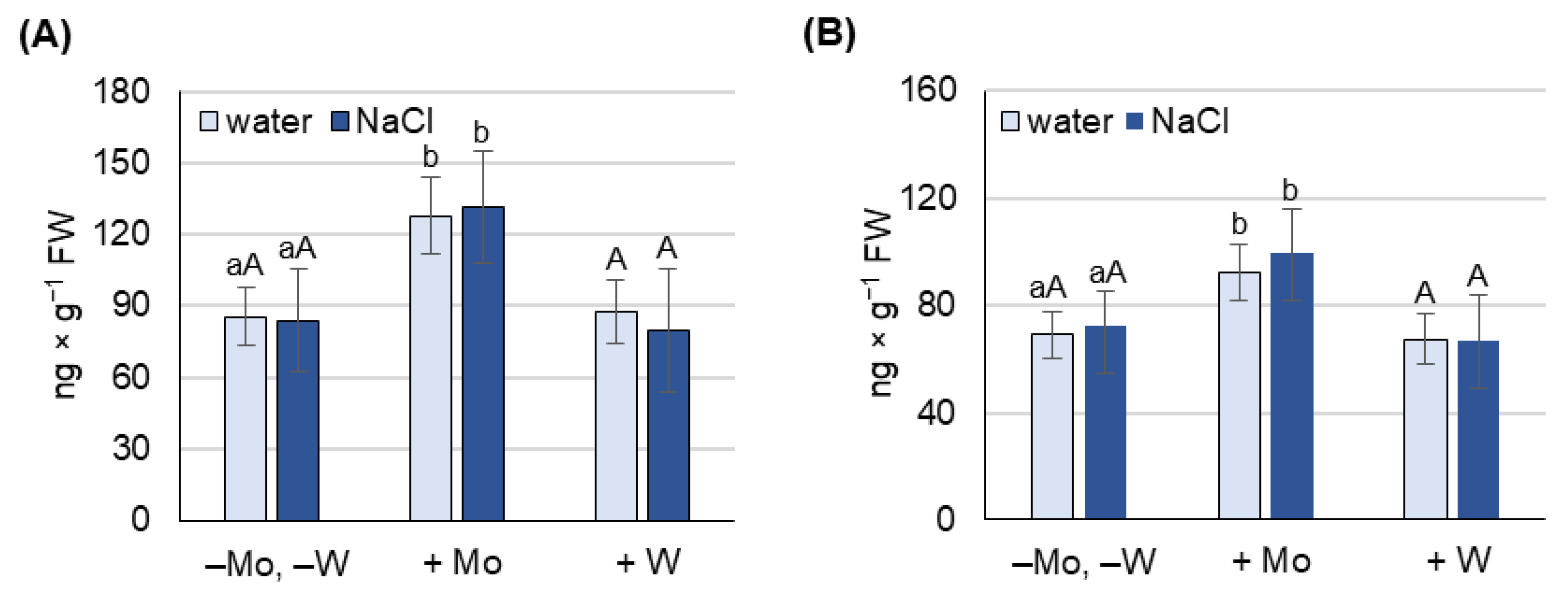 2.4. ABA Concentration as Affected by Salinity and Mo or W Treatment