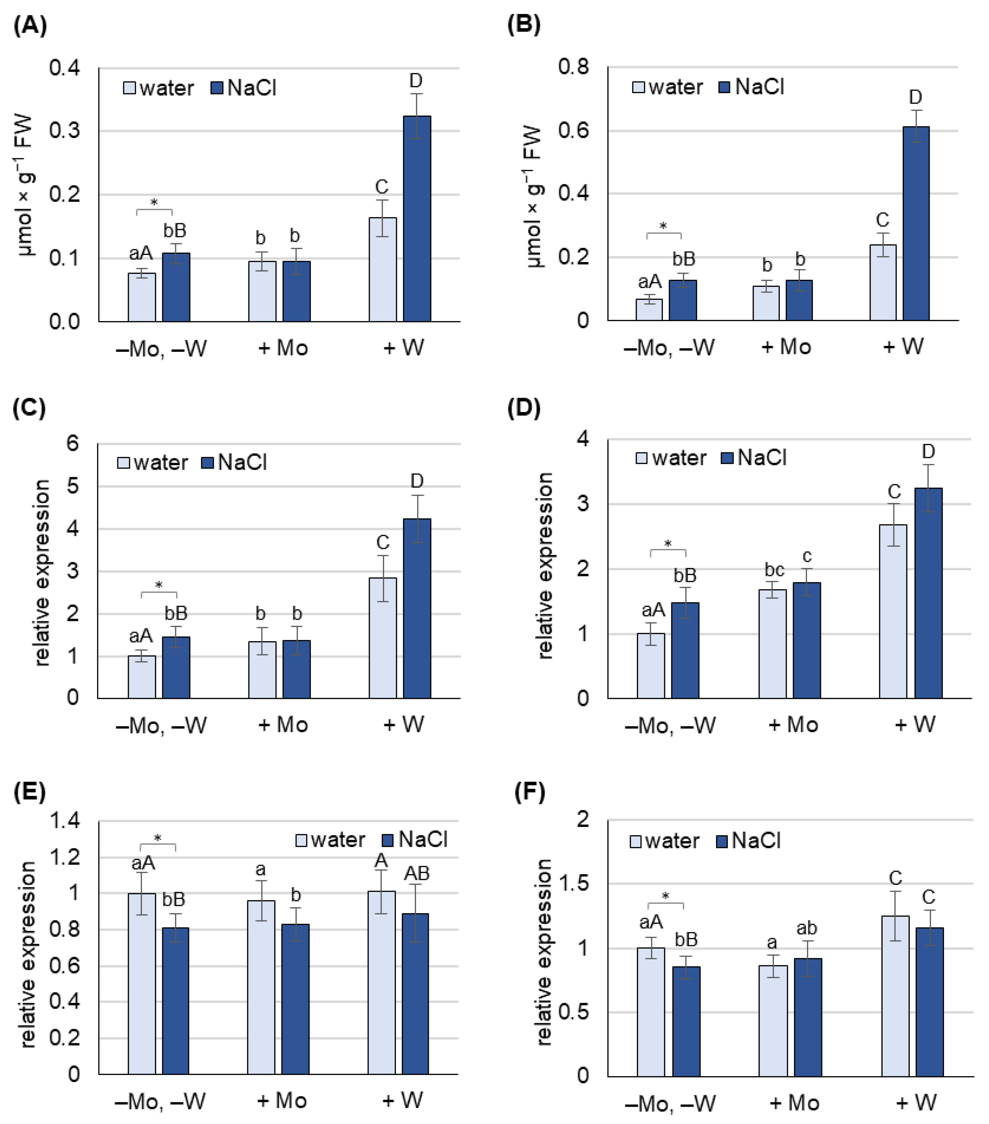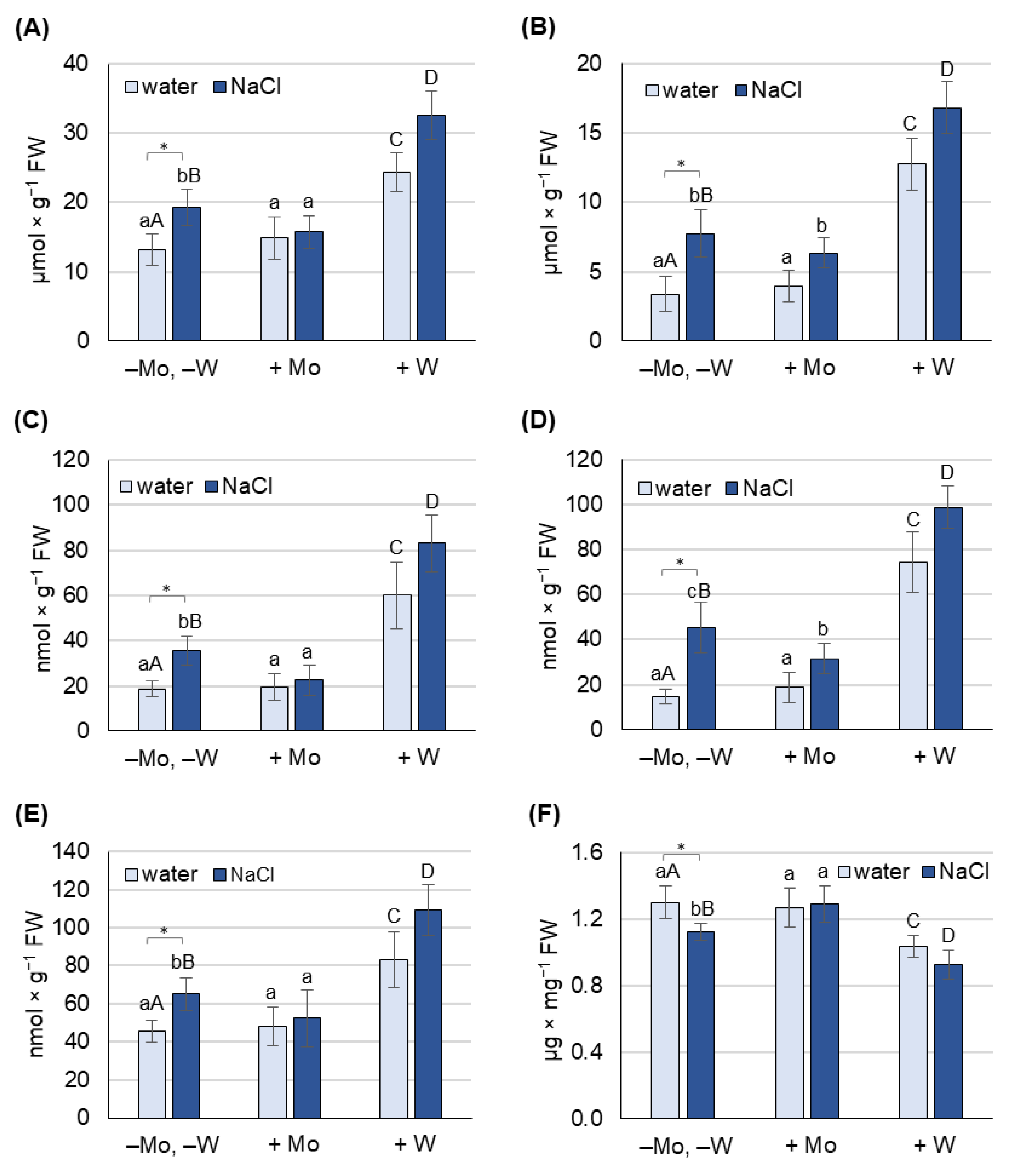 2.5. Aldehyde Oxidase Activity as Affected by Salinity and Mo or W Treatment