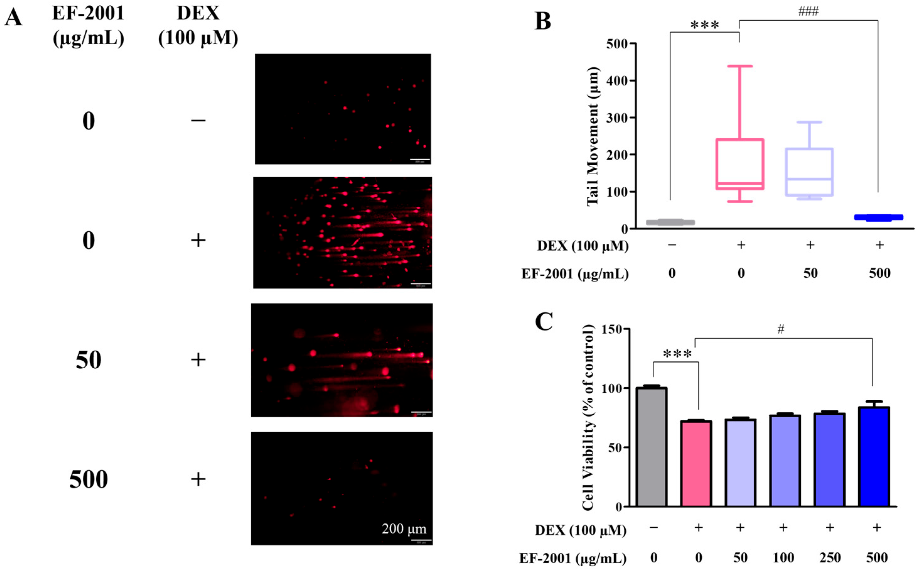 2.1. Effect of Heat-Killed Postbiotic EF-2001 on the Attenuation of DNA Damage and Cell Viability in Dexamethasone-Induced C2C12 Myotubes