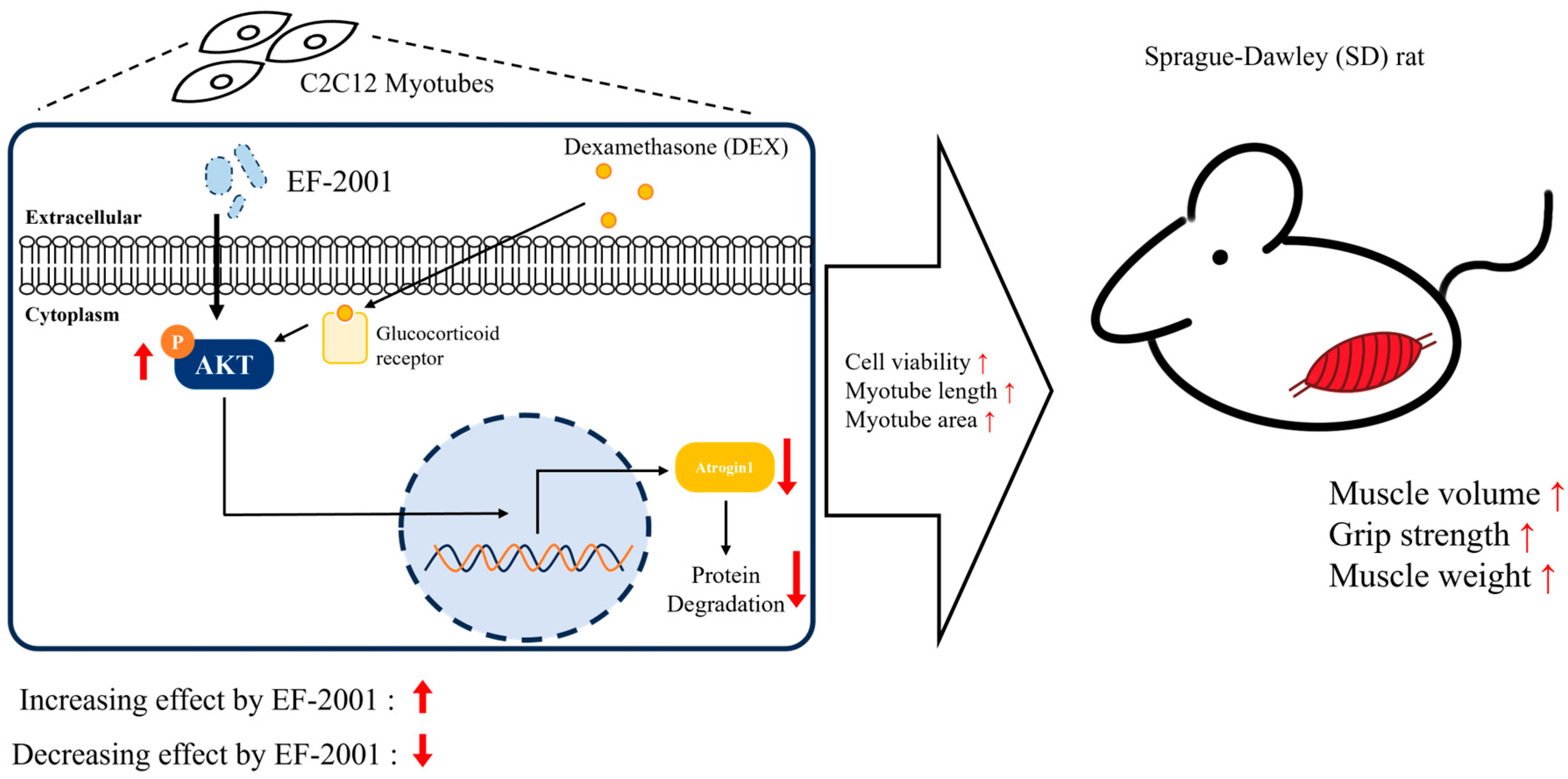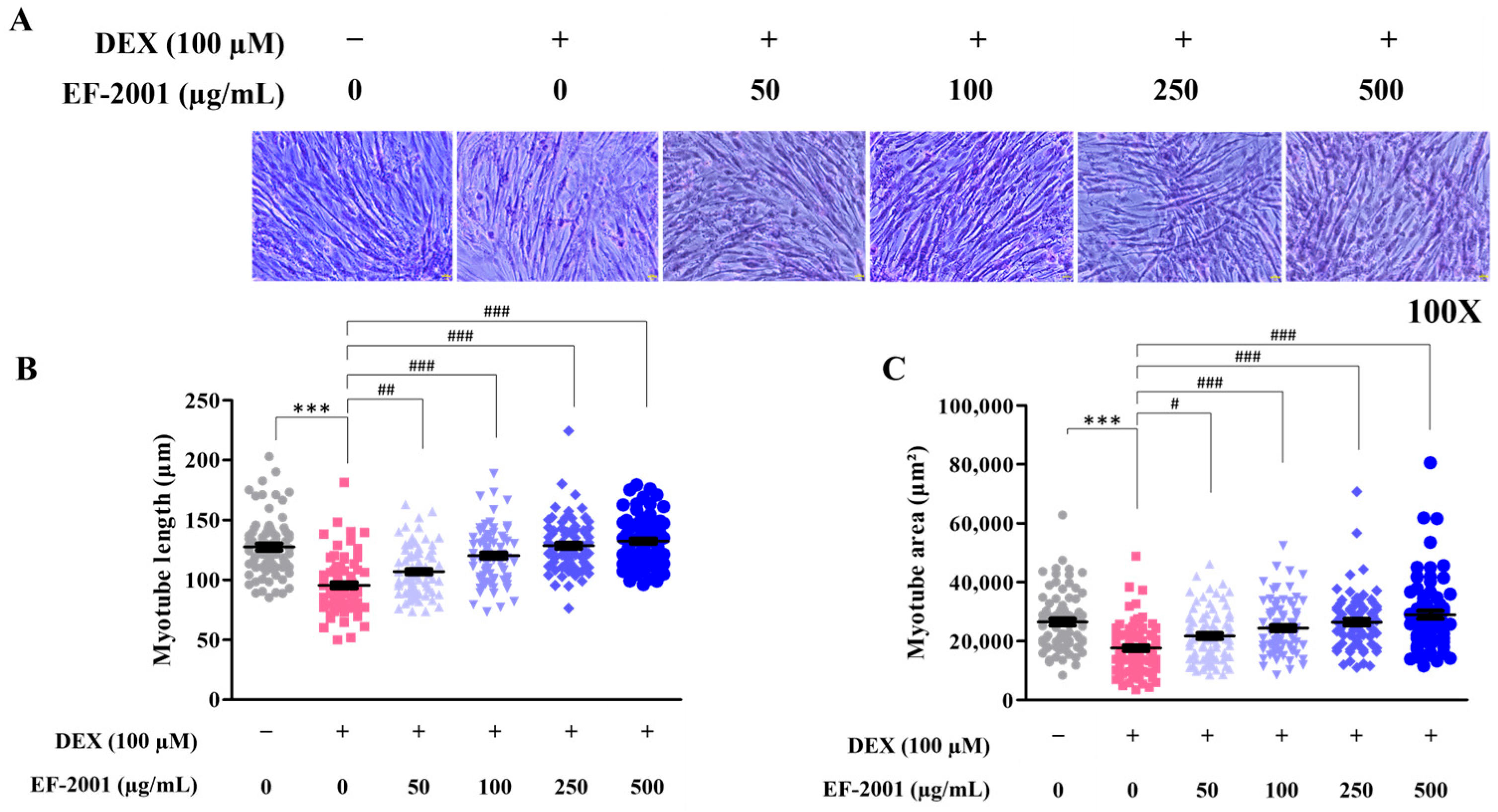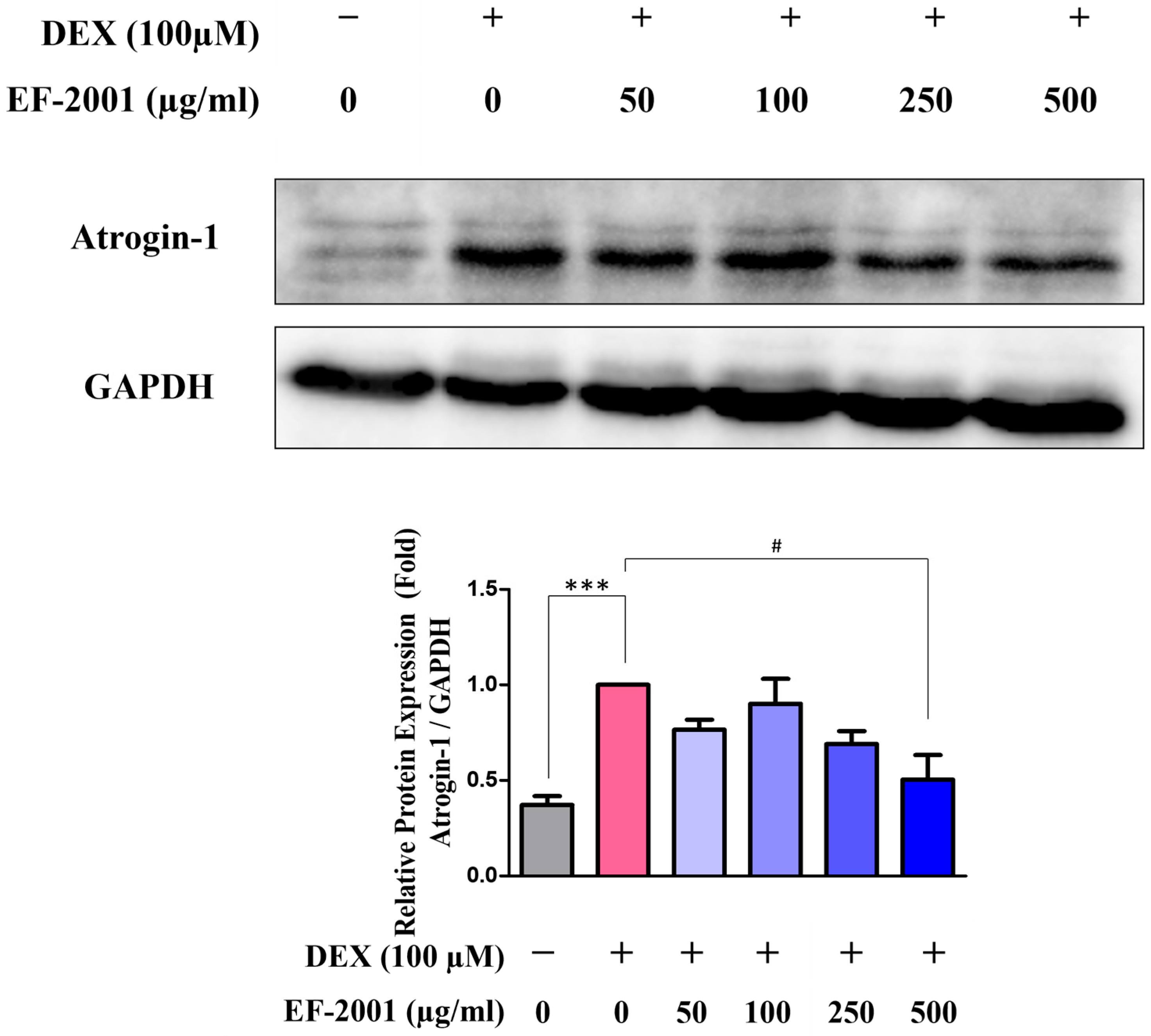 2.2. Effect of Heat-Killed Postbiotic EF-2001 in Preventing Muscle Atrophy in Dexamethasone-Induced C2C12 Myotubes