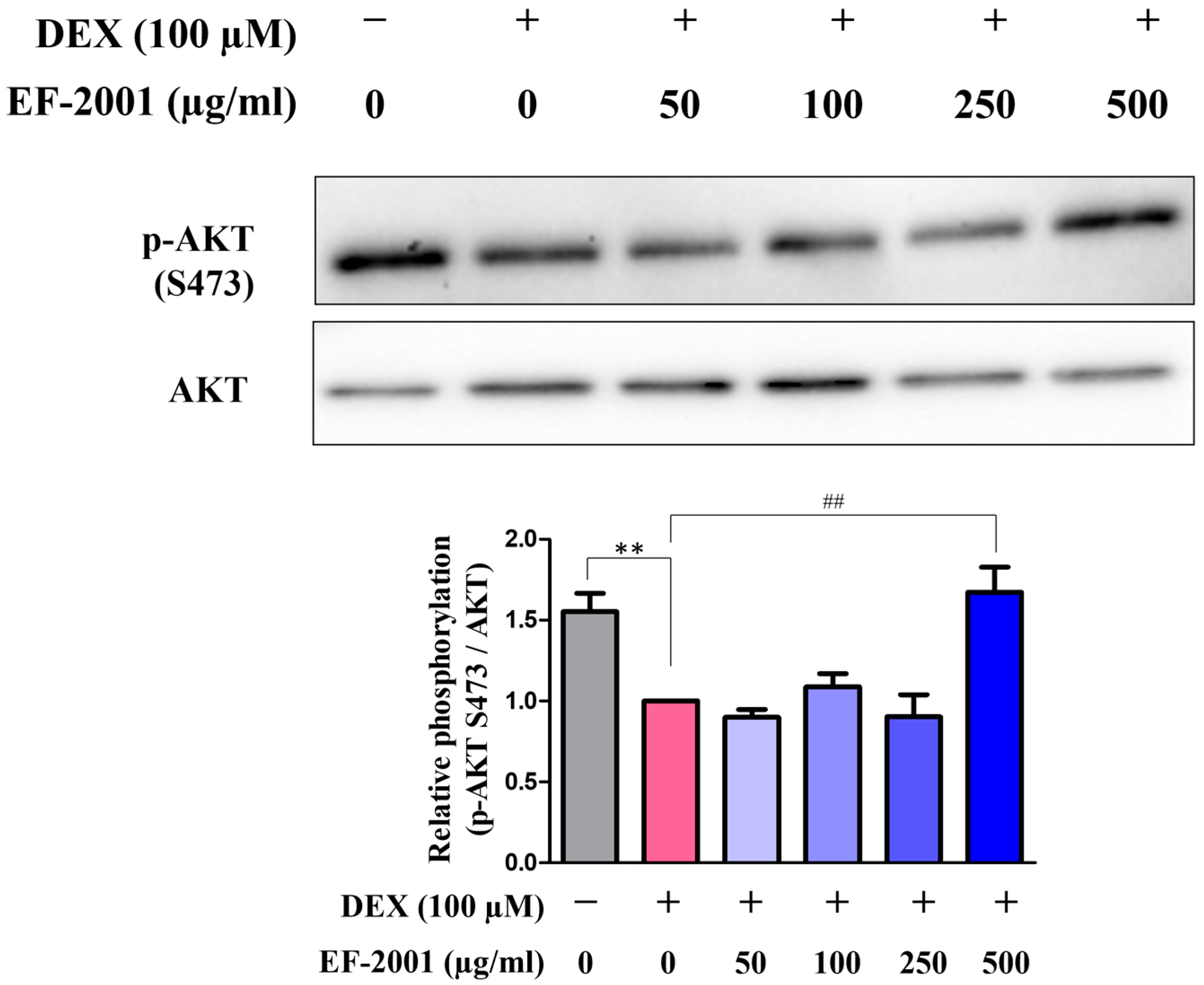 2.3. Effect of Heat-Killed Postbiotic EF-2001 on AKT Signaling Pathway in Dexamethasone-Induced C2C12 Myotubes
