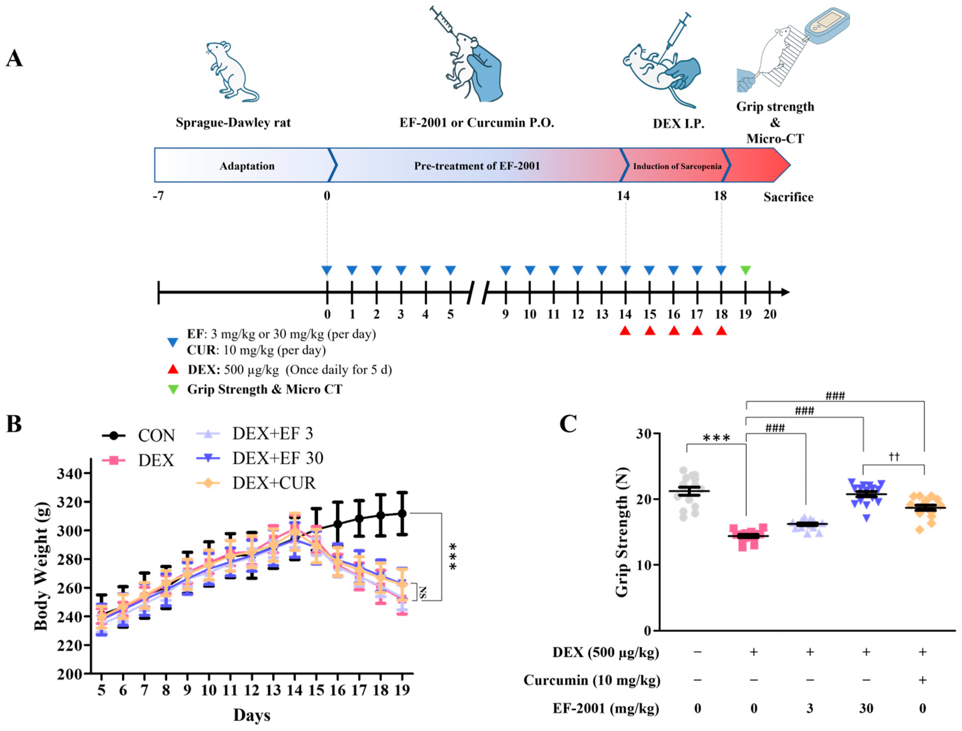 2.5. Effect of Heat-Killed Postbiotic EF-2001 on Body Weight and Grip Strength in Dexamethasone-Induced Muscle Atrophy in Rat Model