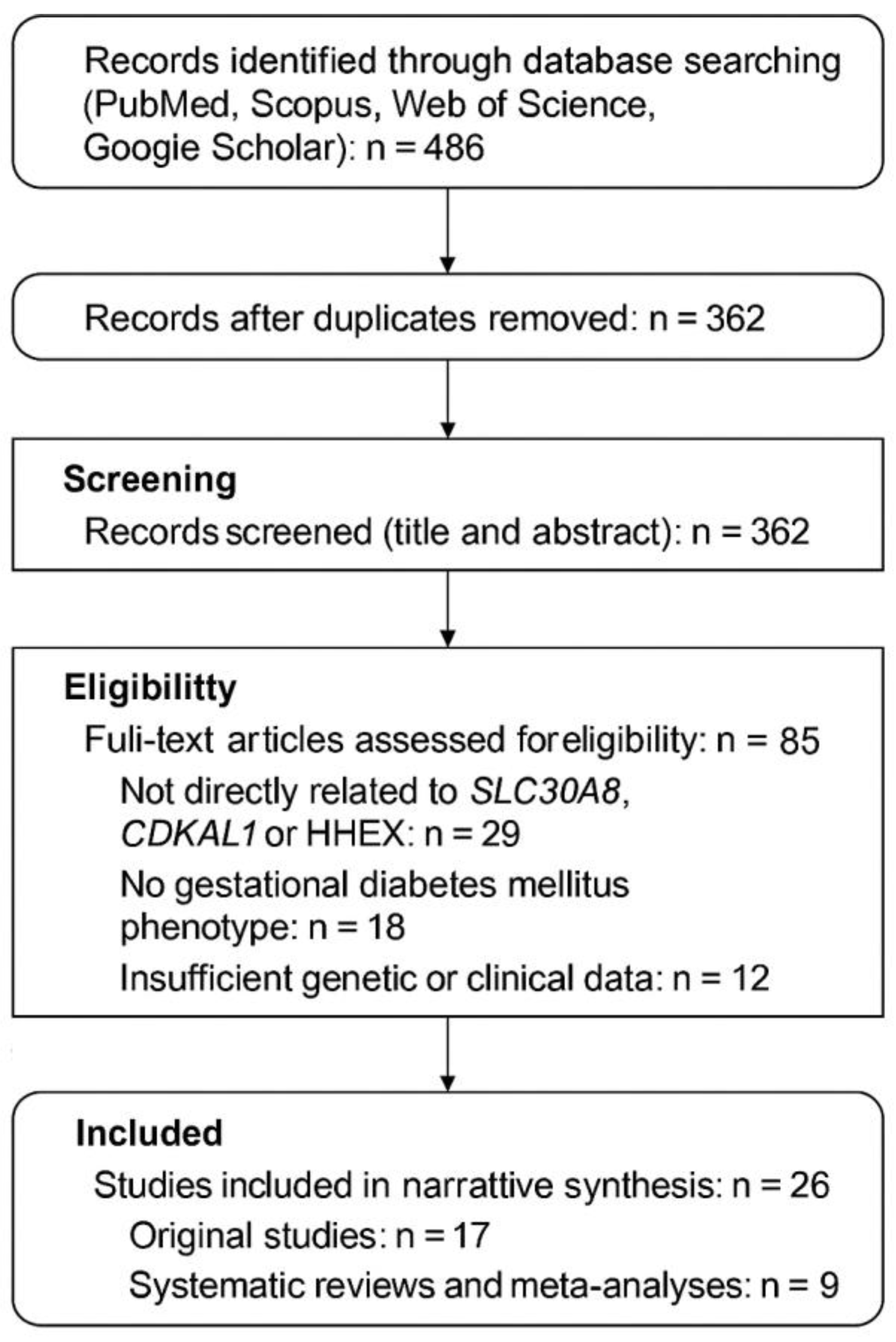 A comprehensive literature search was conducted to identify studies examining the association between genetic variants in the SLC30A8, CDKAL1, and HHEX genes and the development of GDM. Electronic databases including PubMed, Scopus, Web of Science, and Google Scholar were systematically searched for articles published between January 2000 and December 2024 using combinations of Medical Subject Headings (MeSH) and free-text terms such as “gestational diabetes mellitus,” “GDM,” “genetic polymorphism,” “single nucleotide polymorphism,” “SLC30A8,” “CDKAL1,” “HHEX,” “beta-cell dysfunction,” “insulin secretion,” and “glucose metabolism.” Only studies published in English were included. Original research articles, systematic reviews, and meta-analyses involving human subjects were considered eligible if they specifically evaluated the association between the selected gene variants and GDM. Animal studies, case reports, abstracts without full text, and studies not directly addressing GDM were excluded unless they provided essential mechanistic insights supporting clinical interpretation. Titles and abstracts were screened independently by two authors, followed by a full-text review of potentially relevant articles. Data extracted from each eligible publication included study design, population characteristics, sample size, diagnostic criteria for GDM, investigated gene polymorphisms, and reported clinical or functional outcomes. The results were synthesized using a narrative approach focusing on biological relevance and consistency across studies. Study quality was assessed using the Newcastle–Ottawa Scale for observational studies and PRISMA recommendations for meta-analyses. Only studies of moderate to high methodological quality were considered during interpretation. As this review is based solely on previously published data, ethical approval and informed consent were not required. Limitations of this approach included heterogeneity in diagnostic criteria, population differences, and variability in study design, which may have influenced data interpretation. Selected elements of the PRISMA 2020 guidelines were applied to transparently organize the literature identification, screening, and selection process. The review was conducted as a narrative synthesis, and the PRISMA framework was used to systematize inclusion of core genetic studies, while additional references were cited to provide epidemiological, clinical, and mechanistic background (