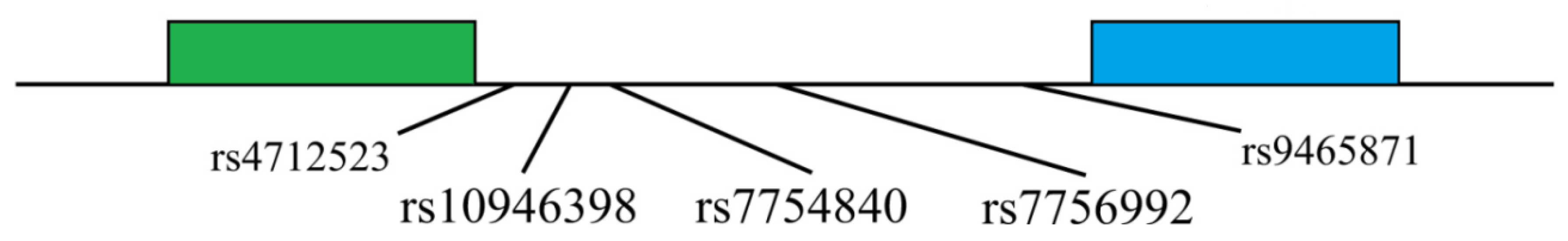 - Li, X.; Li, Y.; Song, B.; Guo, S.; Chu, S.; Jia, N.; Niu, W. Hematopoietically-expressed homeobox gene: Three widely-evaluated polymorphisms and risk for diabetes: A meta-analysis. PLoS ONE 2012, 7, e49917. [Google Scholar] [CrossRef]