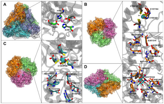 Figure 2B shows the model of L47 BgaA (green), which was built on a GH42 template structure PDB ID: 3TTS (a Bacillus circulans β-galactosidase). BgaA is predicted to form a homotrimer (like other GH42 enzymes). The active site of BgaA is highlighted in gray for L47 and orange for the modeller model. Notably, BgaA has a tryptophan (Trp351, orange stick) where the template enzyme has a conserved histidine, and an alanine (Ala311) where a conserved glutamine would be [26]. These substitutions are near the sugar-binding pocket (inset of Figure 2B). The loss of the histidine at position 351 means one less potential hydrogen bond to lactose (the His in other GH42 enzymes can interact with the substrate’s O4/O3). Trp351, being bulkier and hydrophobic, might alter the binding geometry, possibly reducing affinity slightly but perhaps improving hydrophobic packing. The Zn-binding loop in BgaA (which in other GH42 enzymes coordinates a structural Zn2+) is mutated: as mentioned, three of four cysteines are replaced (indicated in red). In our model, we could not dock a Zn2+ in BgaA because the cysteine ligands are absent (the cyan sphere indicates where Zn would be if the loop were intact). This suggests that structure of BgaA might be somewhat more flexible or less stable in that region, as it cannot be reinforced by a zinc ion.