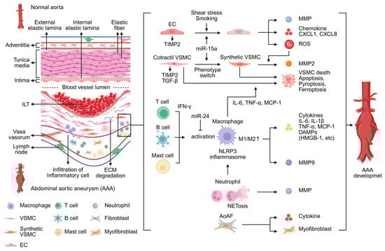 The normal aorta exhibits a three-layered structure with well-preserved elastic fibers. In contrast, abdominal aortic aneurysm (AAA) is characterized by extracellular matrix (ECM) degradation and infiltration of inflammatory cells, accompanied by the formation of an intraluminal thrombus (ILT). AAA development is driven by multiple pathological processes, including inflammatory cell infiltration, vascular smooth muscle cell (VSMC) apoptosis and phenotypic switching, as well as ECM degradation. These pathological changes involve complex interactions among diverse cell types and molecular mechanisms. The figure was created in BioRender. Takahashi, K. (2025) https://BioRender.com/y75hwzj (accessed on 24 December 2025). CXCL, C-X-C motif chemokine ligand; DAMPs, damage-associated molecular patterns; EC, endothelial cell; AoAF, aortic adventitial fibroblasts; HMGB-1, high-mobility group box 1; IFN-γ, interferon-γ; IL, interleukin; MCP-1, monocyte chemoattractant protein-1; MMP, matrix metalloproteinases; NET, neutrophil extracellular trap; NLRP3, NOD-like receptor protein 3; ROS, reactive oxygen species; TIMP2, tissue inhibitor of metalloproteinase 2; TNF-α, tumor necrosis factor-α.