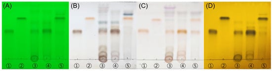 TLC analysis demonstrates the presence of Tax-G in RMB and the generation of Tax-A after enzymatic hydrolysis. (A) UV 254 nm, (B) 10% H2SO4, (C) ρ-anisaldehyde H2SO4, and (D) FeCl3. The eluent system employed was chloroform:methanol:water = 70:30:4 (v/v/v). ① Tax-A, ② Tax-G, ③ RMB, ④ RMB EA layer (RMB RF1), and ⑤ EA layer of enzyme-hydrolyzed RMB (RMB RF2). “RF” denotes “Rich Fraction”, indicating a fraction enriched with the target compound.