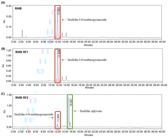 The quantitative changes in Tax-G and Tax-A during the processing steps were monitored via HPLC (Figure 2). In RMB extract sample, the content of Tax-G was calculated to be 107.47 ± 0.45 μg/mL (n = 3), while Tax-A was not detected. In sample RMB RF1, Tax-G was further enriched to 500.00 ± 1.56 μg/mL (n = 3), while Tax-A remained undetectable. In sample RMB RF2, Tax-G content significantly decreased to 41.81 ± 0.08 μg/mL, while Tax-A content markedly increased to 249.95 ± 0.79 μg/mL (n = 3), indicating that the glycosylated form was effectively converted to the aglycone.