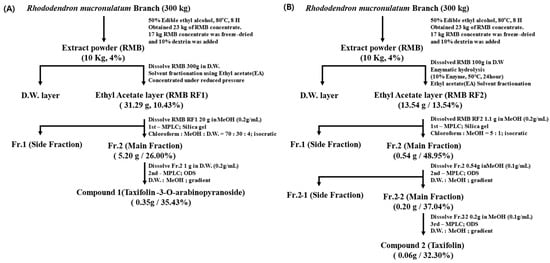 Flowchart of (A) taxifolin-3-O-arabinopyranoside isolation process and (B) taxifolin aglycone isolation process. The side fraction mainly consisted of other minor components. Fr. refers to the fraction, and D.W. refers to the distilled water.