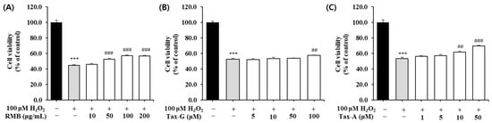 Protective effect of (A) Rhododendron mucronulatum branch extract (RMB), (B) Taxifolin-3-O-arabinopyranoside (Tax-G) and (C) Taxifolin (Tax-A) on cell viability in H2O2-treated C2C12 myoblasts. Values are expressed as the mean ± S.E.M. (n = 4). *** p < 0.001 indicates significantly different from the [H2O2 (−)/Treatment (−)] group. ## p < 0.01 and ### p < 0.001 indicate significantly different from the [H2O2 (+)/Treatment (−)] group. Treatment refers to the administration of RMB, Tax-G, or Tax-A.