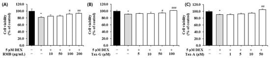 To investigate the effects of the three test substances on dexamethasone (DEX)-induced muscle cell damage, each substance was applied to a C2C12 muscle atrophy model induced with 5 μM DEX, and the cell viability of myotubes was measured. Compared with the control group, the cell viability of the DEX-treated group decreased to as low as 81.8 ± 2.4%. RMB treatment significantly increased cell viability at concentrations of 100 and 200 μg/mL (Figure 6A), Tax-G treatment at concentrations of 50 and 100 μM (Figure 6B), and Tax-A treatment at a concentration of 50 μM (Figure 6C), compared with the DEX-treated group.