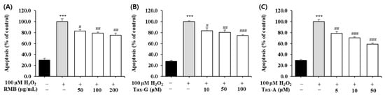 To evaluate the effects of RMB, Tax-G, and Tax-A on oxidative stress-induced apoptosis, DNA fragmentation was quantified using a Cellular DNA Fragmentation ELISA kit. The H2O2-treated group showed a significant increase in apoptosis compared with the untreated control group (Figure 7). RMB treatment significantly reduced apoptosis starting at 50 μg/mL, and at the highest concentration of 200 μg/mL, apoptosis decreased by 24.7% compared with the H2O2-treated group (Figure 7A). Tax-G treatment significantly reduced apoptosis starting at 10 μM, and at the highest concentration of 100 μM, apoptosis decreased by 25.5% compared with the H2O2-treated group (Figure 7B). Tax-A treatment significantly reduced apoptosis starting at 5 μM, and at the highest concentration of 50 μM, apoptosis decreased by 41.1% compared with the H2O2-treated group (Figure 7C).