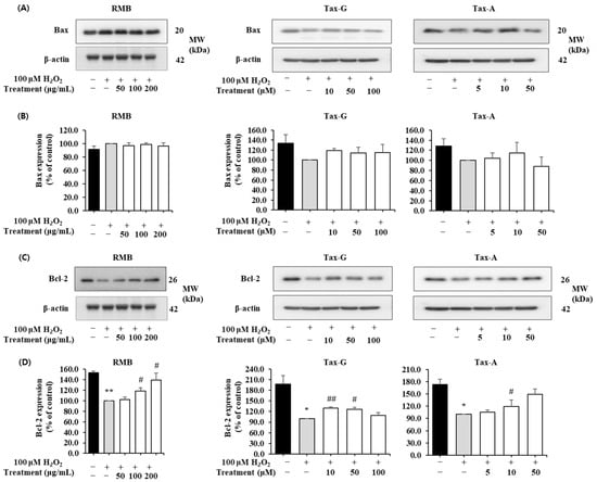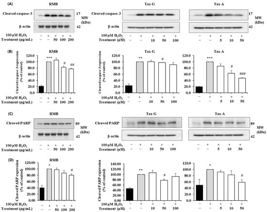 In the H2O2-induced apoptosis model, the effects of RMB, Tax-G, and Tax-A treatments on the expression of Bax, Bcl-2, cleaved caspase-3, and cleaved PARP proteins were analyzed, and the results are shown in Figure 8 and Figure 9. The expression of Bax did not show significant differences among the control group, the H2O2-treated group, and the groups treated with the test substances (Figure 8A,B). In contrast, the expression of Bcl-2 was significantly decreased in the H2O2-treated group compared with the control group. This decrease was significantly restored by treatment with RMB (100 and 200 μg/mL), Tax-G (10 and 50 μM), and Tax-A (50 μM) (Figure 8D). In particular, Bcl-2 expression in the groups treated with RMB (200 μg/mL), Tax-G (10 μM), and Tax-A (50 μM) increased by 38.8%, 30.1%, and 48.7%, respectively, compared with the H2O2-treated group.