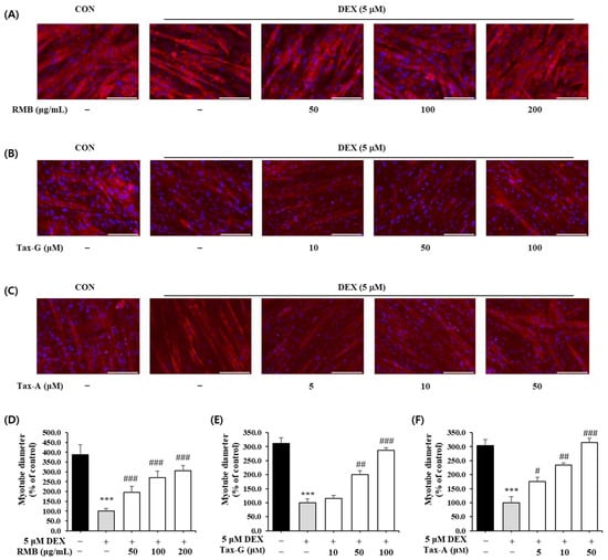 The effects of the three test substances on dexamethasone (DEX)-induced muscle atrophy were evaluated by measuring the diameter of myotubes. Treatment with 5 μM DEX significantly reduced myotube diameter by approximately 70.3% compared with the control group (Figure 10). In contrast, treatment with RMB, Tax-G, and Tax-A significantly increased myotube diameters in a concentration-dependent manner compared with the DEX-treated group, and at the highest concentrations, the diameters were restored to control levels. At their highest concentrations, RMB, Tax-G, and Tax-A increased myotube diameters by 206.3%, 186.1%, and 215.0%, respectively, compared with the DEX-treated group (Figure 10).