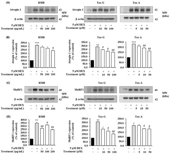 Protein expression of the muscle degradation-related factors Atrogin-1 and MuRF1 was significantly increased in the DEX-treated group compared with the control group (Figure 11). In the case of Atrogin-1, treatment with the test substances reduced its expression in a concentration-dependent manner; RMB significantly reduced expression at 200 μg/mL, and Tax-G and Tax-A significantly reduced expression at concentrations of 10 μM or higher (Figure 11A,B). At the highest treatment concentrations of each group, Atrogin-1 expression decreased by 23.97%, 26.23%, and 29.86% with RMB, Tax-G, and Tax-A treatment, respectively, compared with the DEX-treated group. Meanwhile, MuRF expression was significantly reduced at all concentrations of RMB, at 50 and 100 μM of Tax-G, and at 10 and 50 μM of Tax-A (Figure 11C,D). At the highest treatment concentrations, MuRF expression decreased by 34.95%, 46.46%, and 16.03% with RMB, Tax-G, and Tax-A treatment, respectively, compared with the DEX-treated group.