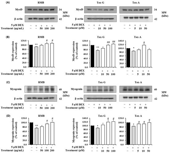 In contrast, the expression of the muscle synthesis-related proteins MyoD and Myogenin was significantly decreased in the DEX-treated group compared with the control group (Figure 12). MyoD expression was significantly increased at 100 and 200 μg/mL of RMB, at 50 and 100 μM of Tax-G, and at 10 μM of Tax-A (Figure 12A,B). Compared with the DEX-treated group, MyoD expression increased by 17.66% with 200 μg/mL RMB, 38.30% with 100 μM Tax-G, and 37.93% with 10 μM Tax-A. Myogenin expression was significantly increased at 100 and 200 μg/mL of RMB, at 50 and 100 μM of Tax-G, and at all treatment concentrations of Tax-A (Figure 12C,D). At the highest treatment concentrations, Myogenin expression increased by 35.05%, 39.67%, and 20.29% with RMB, Tax-G, and Tax-A, respectively, compared with the DEX-treated group.