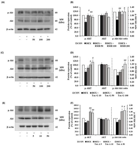 The expression of p-Akt was significantly decreased in the DEX-treated group compared with the control group, whereas treatment with RMB (50 and 100 μg/mL), Tax-G (50 and 100 μM), and Tax-A (10 and 50 μM) significantly restored the reduced expression of p-Akt (Figure 13). The expression of Akt did not differ significantly among the control, DEX-treated groups and any treatment groups. The p-Akt/Akt ratio was significantly decreased in the DEX-treated group compared with the control group. This decrease was significantly reversed at all treatment concentrations of RMB, at 50 and 100 μM of Tax-G, and at 10 and 50 μM of Tax-A (Figure 13).