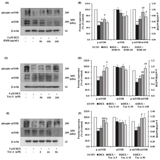 Effect of (A,B) Rhododendron mucronulatum branch extract (RMB), (C,D) Taxifolin-3-O-arabinopyranoside (Tax-G), and (E,F) Taxifolin (Tax-A) on the protein expression of phospho-mTOR and mTOR in DEX-treated C2C12 myotubes. Protein expression was assessed via Western blotting, with β-actin as the normalization standard, and expressed relative to the CON group. Values are reported as the mean ± S.E.M. (n = 3). * p < 0.05, ** p < 0.01, and *** p < 0.001 indicate significantly different from the [DEX (−)/Treatment (−)] group. # p < 0.05, ## p < 0.01, and ### p < 0.001 indicate significantly different from the [DEX (+)/Treatment (−)] groups. Treatment refers to the administration of RMB, Tax-G, or Tax-A.