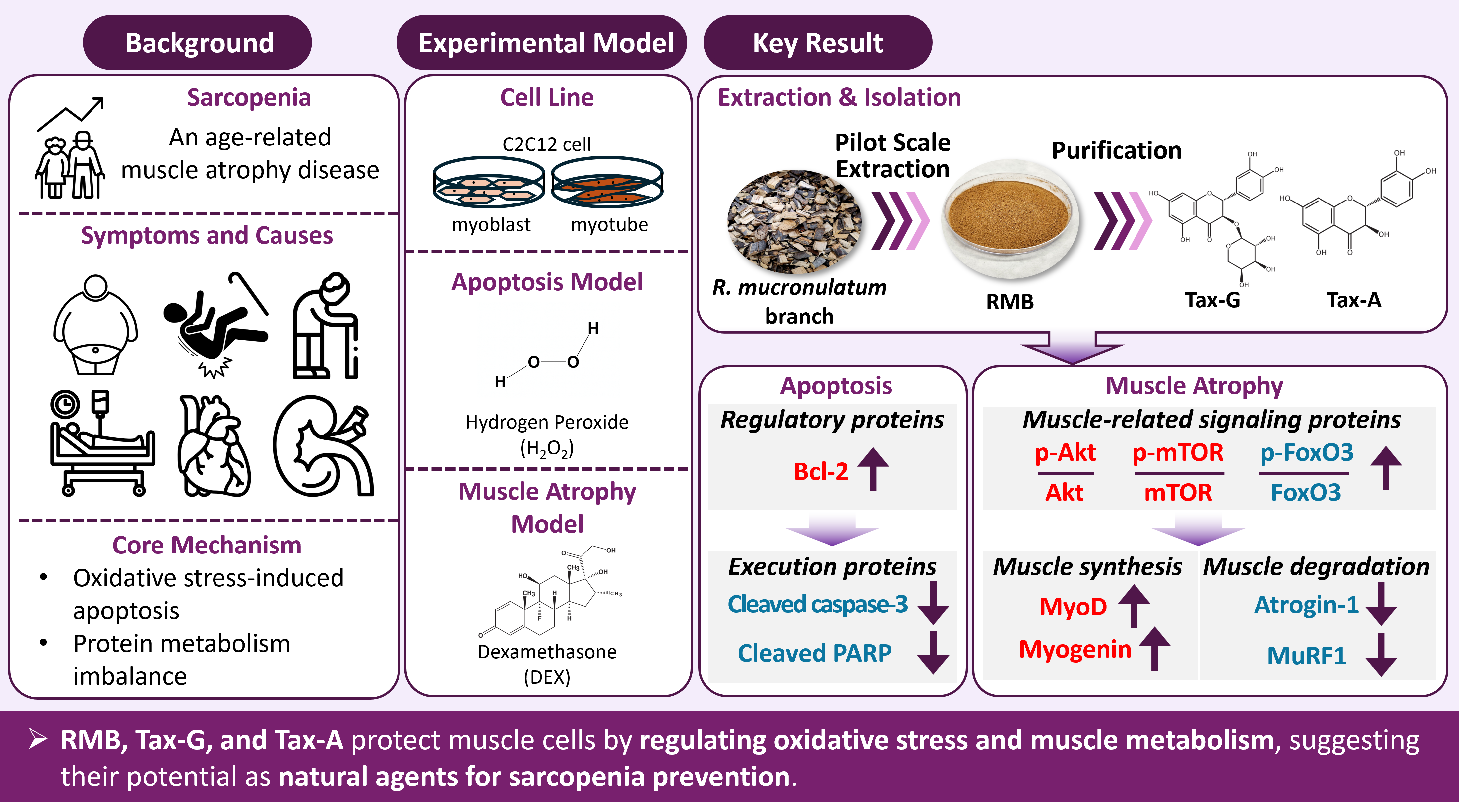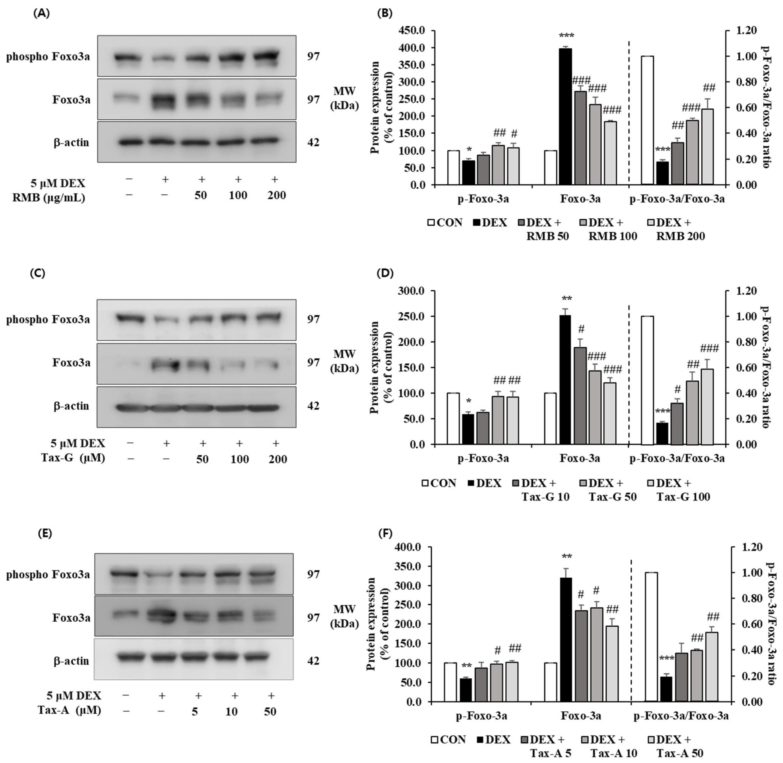 4.7. Effects of Rhododendron mucronulatum Branch Extract (RMB), Taxifolin-3-O-Arabinopyranoside (Tax-G) and Taxifolin (Tax-A) on Muscle Apoptosis Biomarkers