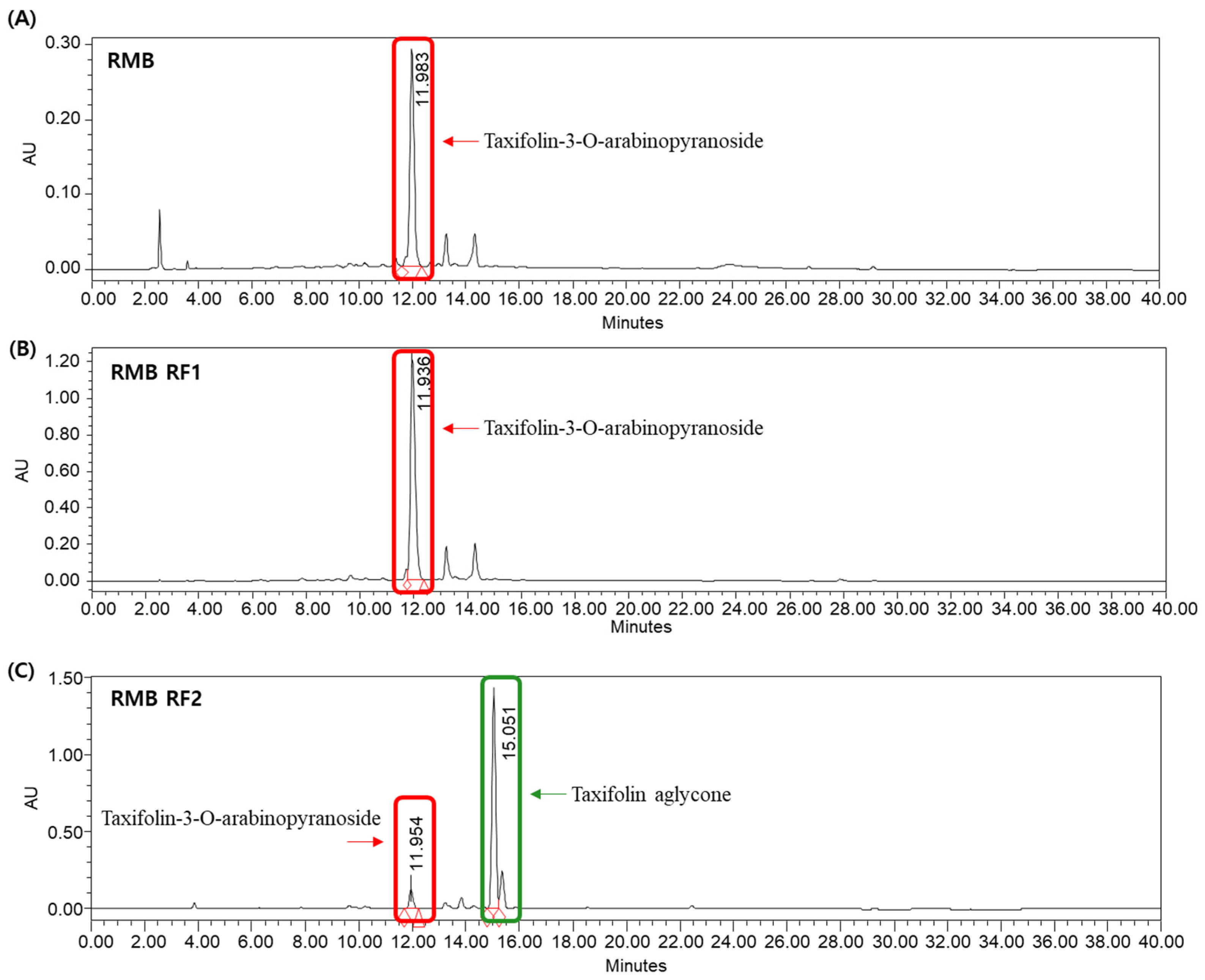 - Kim, T.H.; Kwon, Y.E.; Park, S.M.; Kim, M.S.; Jeong, Y.H.; Park, S.Y.; Bae, Y.-S.; Cheong, E.J.; He, Y.-C.; Gong, C. Chemotaxonomic significance of taxifolin-3-O-arabinopyranoside in Rhododendron species native to Korea. J. For. Environ. Sci. 2022, 38, 159–173. [Google Scholar]