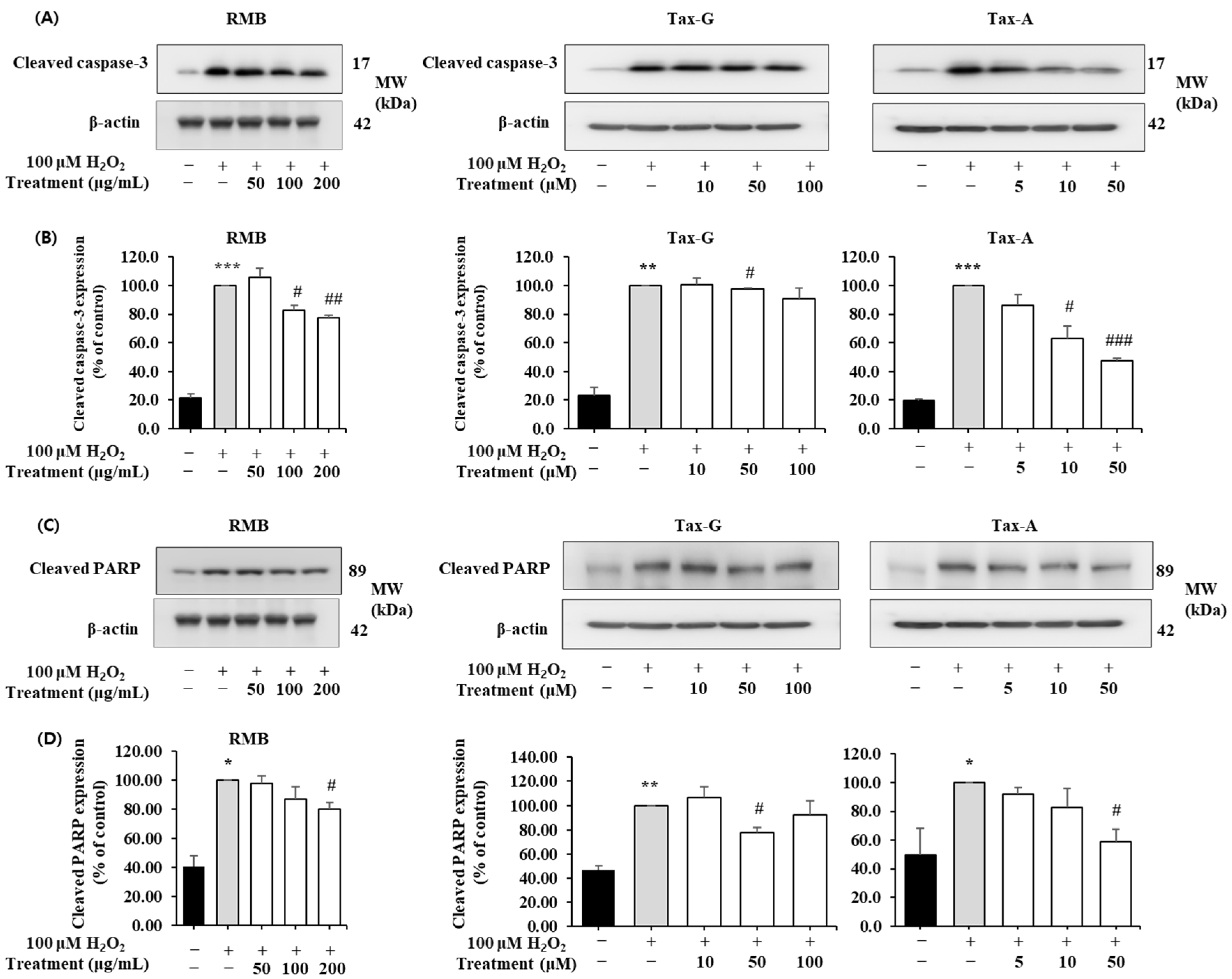 2.4.2. Effects of RMB, Tax-G and Tax-A on Bax, Bcl-2, Cleaved Caspase-3, and Cleaved PARP Protein Expression