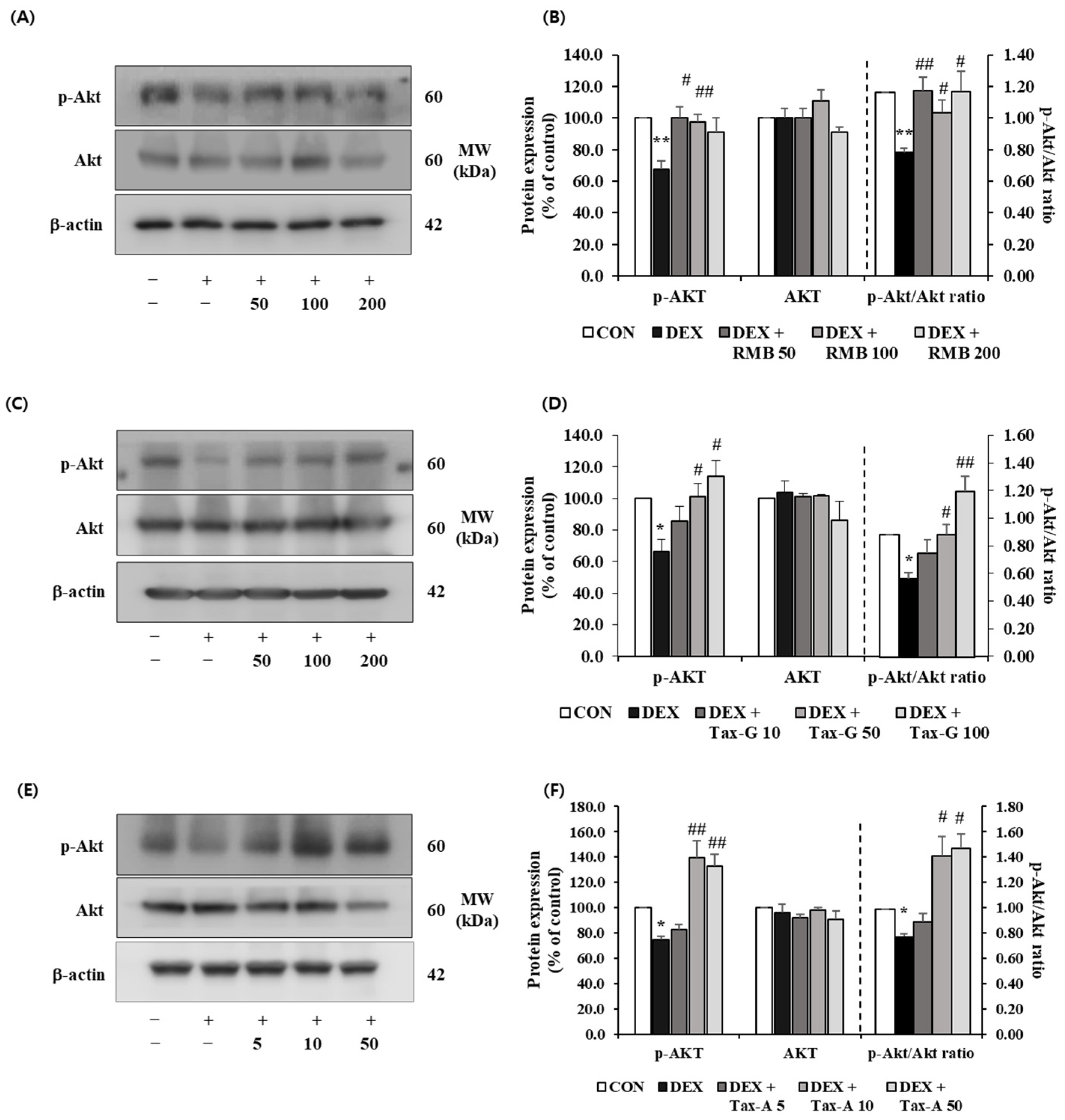 4.8. Effects of Rhododendron mucronulatum Branch Extract (RMB), Taxifolin-3-O-Arabinopyranoside (Tax-G) and Taxifolin (Tax-A) on Muscle-Synthesis- and Muscle-Degradation Biomarkers