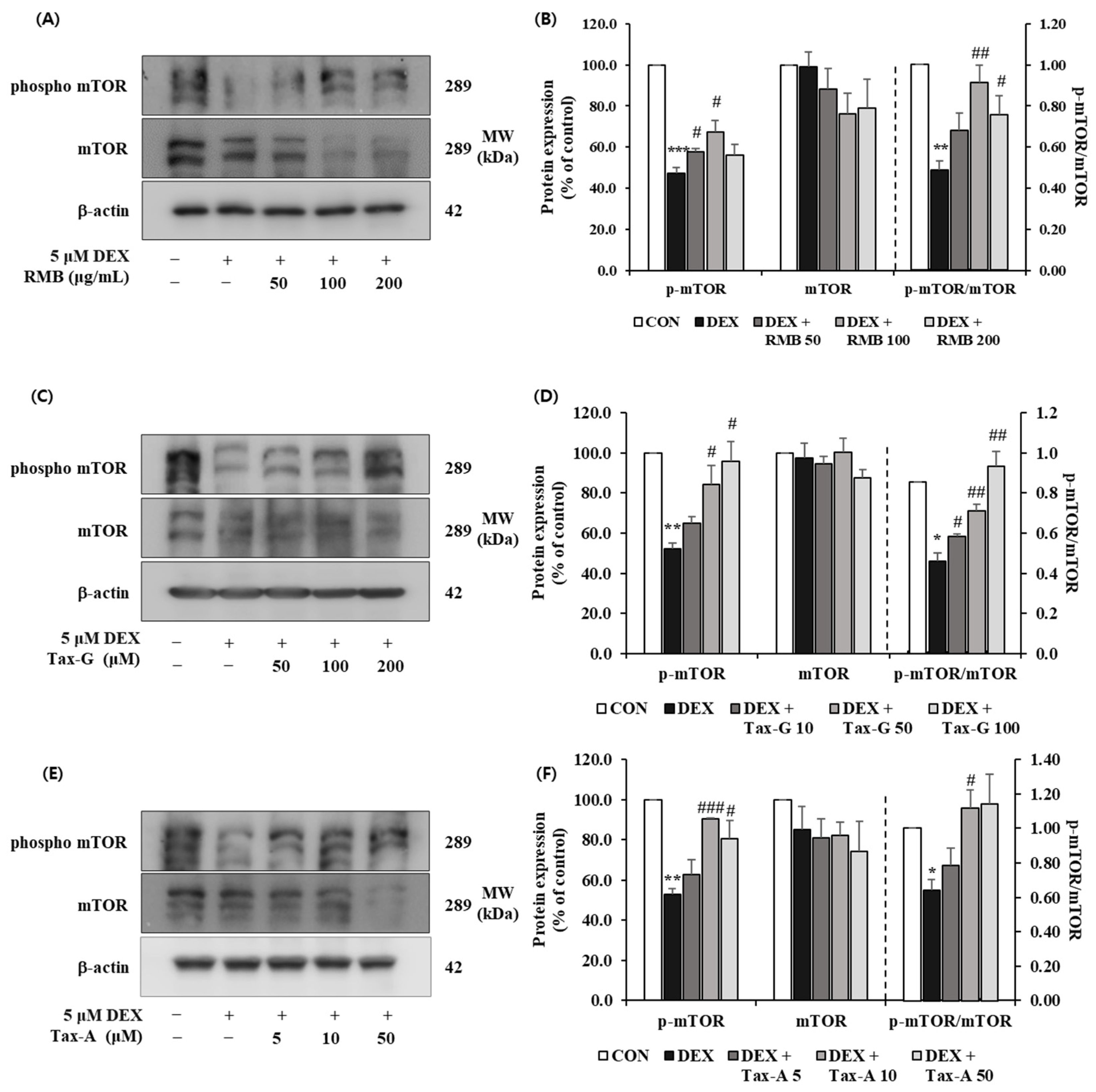 2.5. Effects of Rhododendron mucronulatum Branch Extract (RMB), Taxifolin-3-O-Arabinopyranoside (Tax-G) and Taxifolin (Tax-A) on Muscle-Synthesis- and Muscle-Degradation-Related Proteins and Gene Expression