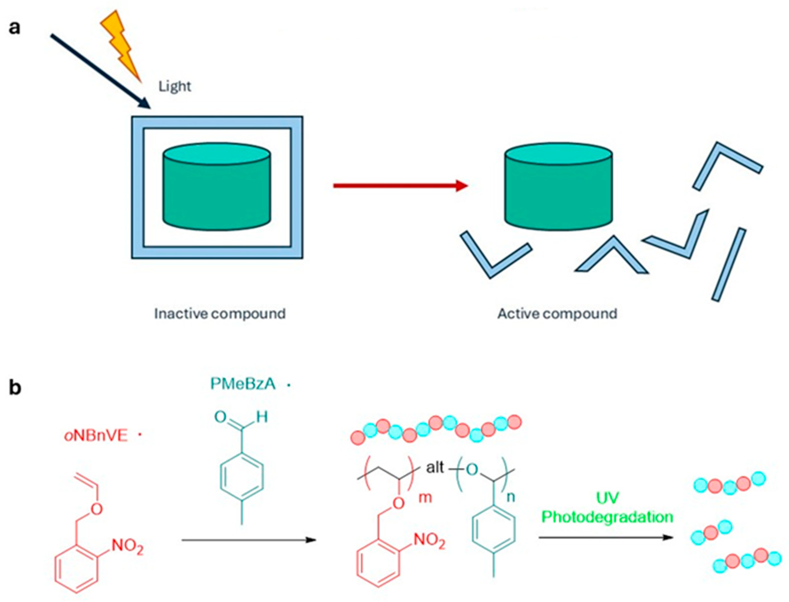 - Kubota, H.; Ouchi, M. Rapid and Selective Photo-Degradation of Polymers: Design of an Alternating Copolymer with an o-Nitrobenzyl Ether Pendant. Angew. Chem. Int. Ed. 2023, 62, e202217365. [Google Scholar] [CrossRef] [PubMed]