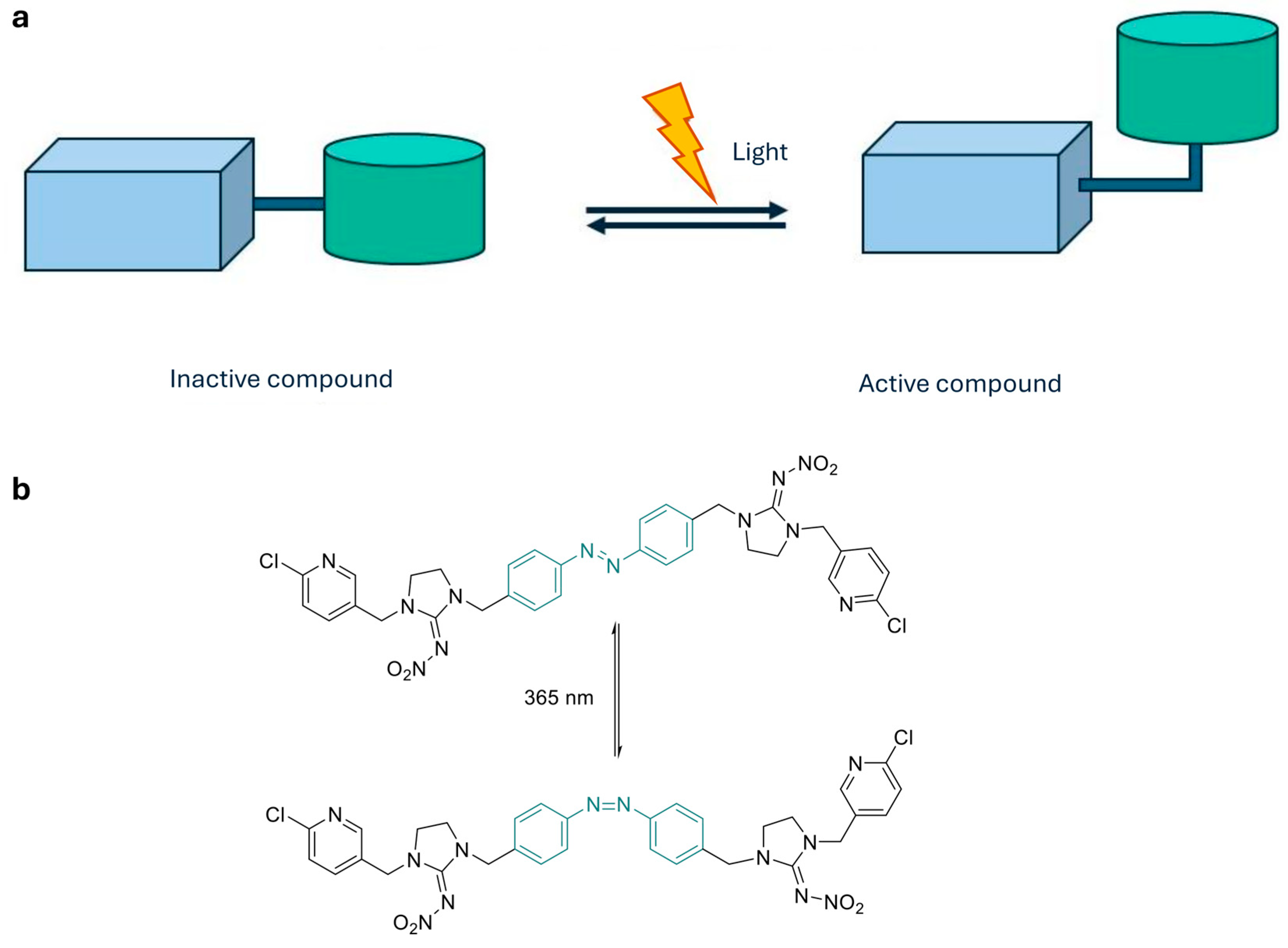 - Xu, Z.; Shi, L.; Jiang, D.; Cheng, J.; Shao, X.; Li, Z. Azobenzene-Modified Imidacloprid Derivatives as Photoswitchable Insecticides: Steering Molecular Activity in a Controllable Manner. Sci. Rep. 2015, 5, 13962. [Google Scholar] [CrossRef] [PubMed]