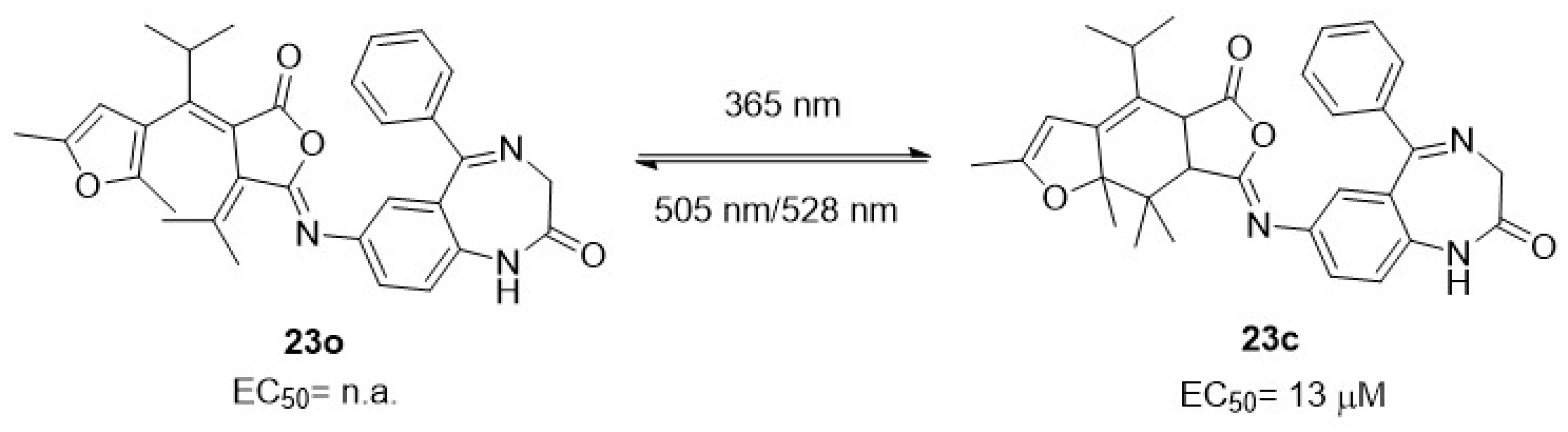 - Rustler, K.; Maleeva, G.; Gomila, A.M.J.; Gorostiza, P.; Bregestovski, P.; Kçnig, B. Optical Control of GABA A Receptors with a Fulgimide-Based Potentiator. Chem. Eur. J. 2020, 26, 12722–12727. [Google Scholar] [CrossRef]