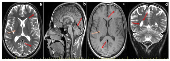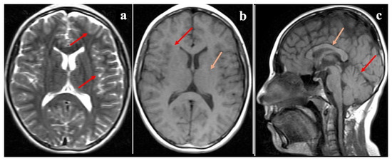 Cranial MR images of the younger sibling (Proband 2, P2) at 12 years of age. (a) T2-weighted axial image demonstrates normal cerebral sulci and gyri (red arrows). (b) T1-weighted axial image demonstrates normal cerebral sulci and gyri (red arrow) and basal ganglia (orange arrow). (c) T2-weighted axial image demonstrates a normal corpus callosum (orange arrow), with no evidence of cerebellar atrophy (red arrow).