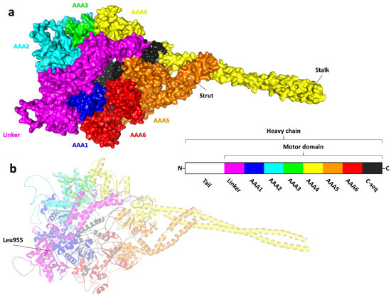 Overall structure of the axonemal dynein motor domain. (a) Surface representation of a homology model of the motor domain of human wild-type dynein axonemal heavy chain 14, with individual subdomains color-coded. (b) Transparent ribbon representation of the same model, showing the affected amino acid residue (Leu955) in stick representation. Inset: schematic of the domain architecture, using the same color scheme.