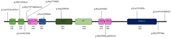 In an attempt to visualize the potential impact of the identified gene variant on the corresponding protein’s conformation, stability, and function, we used a comparative model of human dynein axonemal heavy chain 14 (Figure 4). This model was based on a 2.8 Å x-ray structure of the Dictyostelium discoideum dynein motor domain, which lacks the microtubule-binding subdomain (PDB ID: 3VKG) [20] and is archived in ModBase (Accessed Date: http://salilab.org/modbase; accessed on 10 November 2025). As inferred from protein homology, the domain organization of human dynein axonemal heavy chain 14 follows the canonical dynein heavy chain structure, featuring specialized adaptations for its role in axonemal function. Similar to other dynein heavy chains, human dynein axonemal heavy chain 14 consists of an N-terminal tail domain and a motor domain. The tail domain plays a critical role in binding accessory proteins and regulatory subunits, thereby facilitating the assembly of the dynein complex and ensuring proper ciliary localization. The motor domain is further subdivided into a linker subdomain, six AAA+ (ATPase associated with diverse cellular activities) modules (AAA1–AAA6), a coiled-coil stalk and strut, and a C-terminal sequence, which together drive the motor’s ATP-dependent activity and ciliary motility. At the tip of the coiled-coil stalk, which protrudes from AAA4, resides a microtubule-binding subdomain (missing in the present protein model) essential for dynein’s interaction with microtubules.