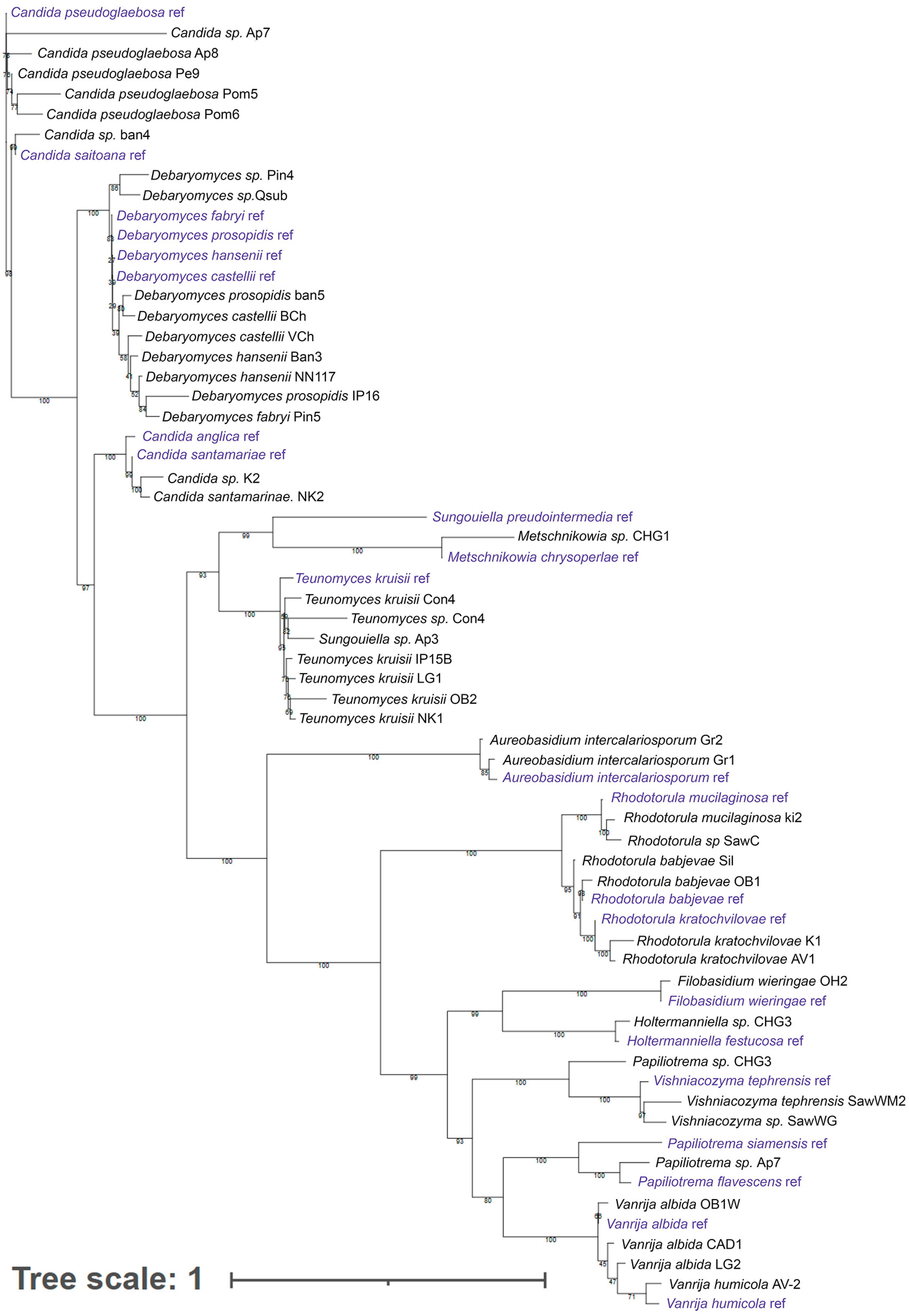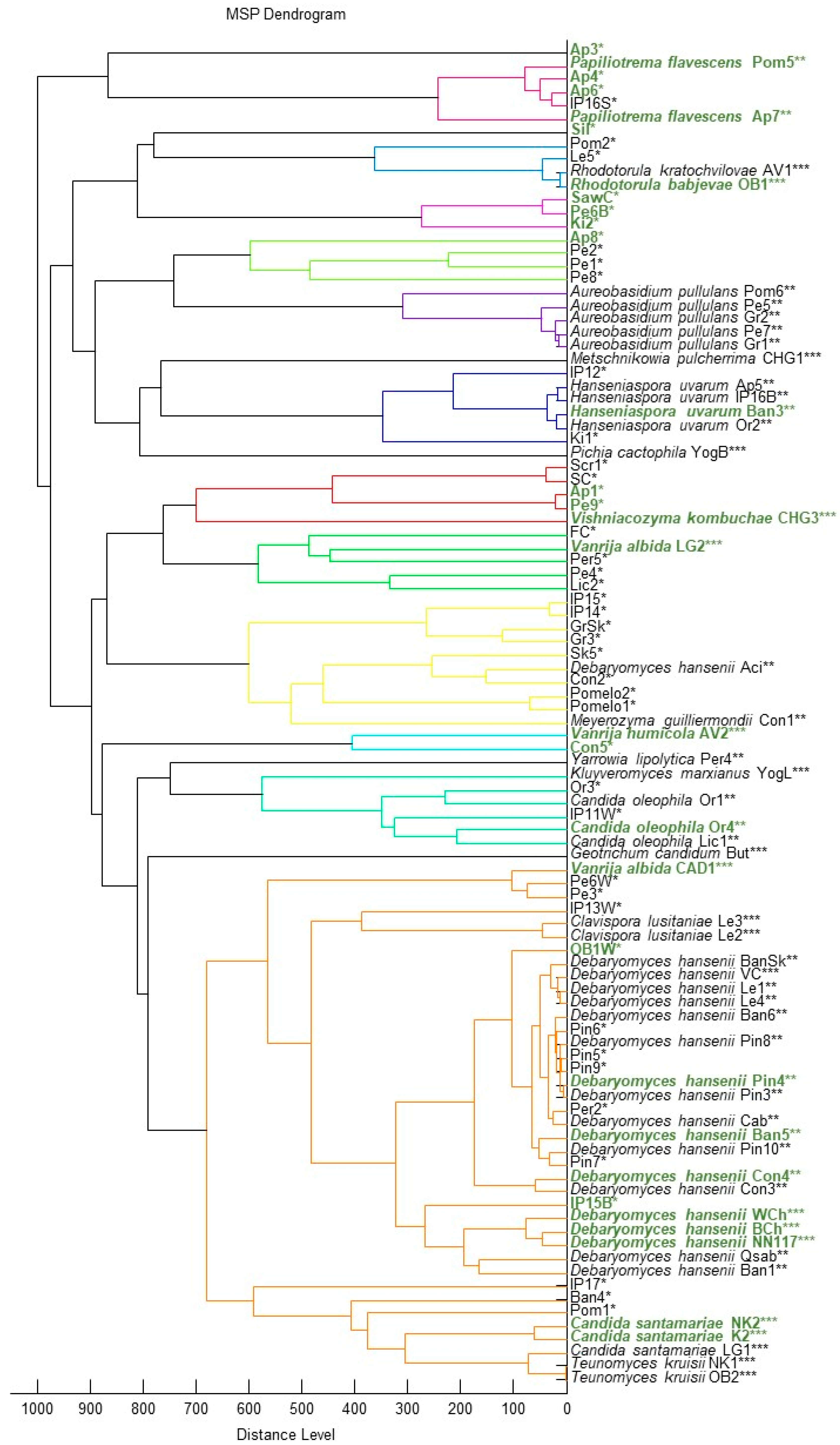- Vu, D.; Groenewald, M.; Szoke, S.; Cardinali, G.; Eberhardt, U.; Stielow, B.; de Vries, M.; Verkleij, G.J.; Crous, P.W.; Boekhout, T.; et al. DNA barcoding analysis of more than 9000 yeast isolates contributes to quantitative thresholds for yeast species and genera delimitation. Stud. Mycol. 2016, 85, 91–105. [Google Scholar] [CrossRef] [PubMed]