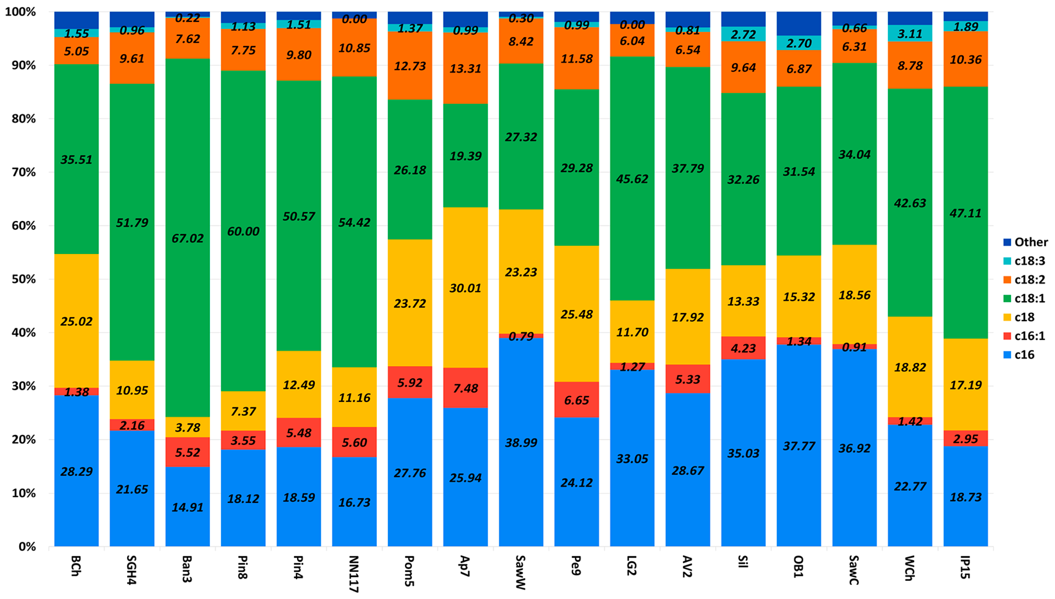 | C18:0 | 4–8 | 11.7 | 4–8 | 14.95 | 33–40 | 24.09 | 11.47 | 34.75 |
