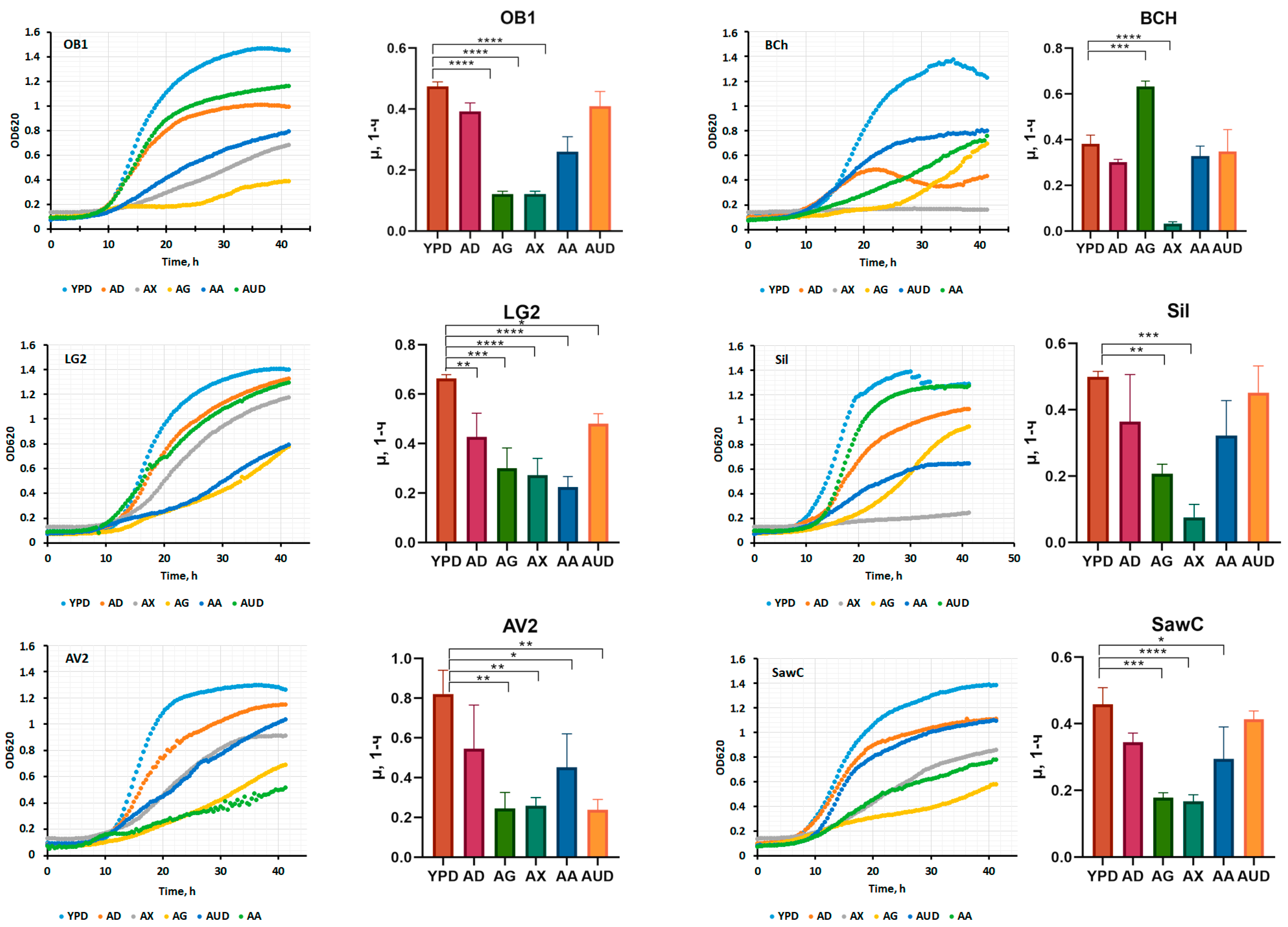 4.2. Physiological Test of Yeasts: Determination of the Ability to Grow on Different Carbon Sources, Growth Curves, and Biomass Accumulation