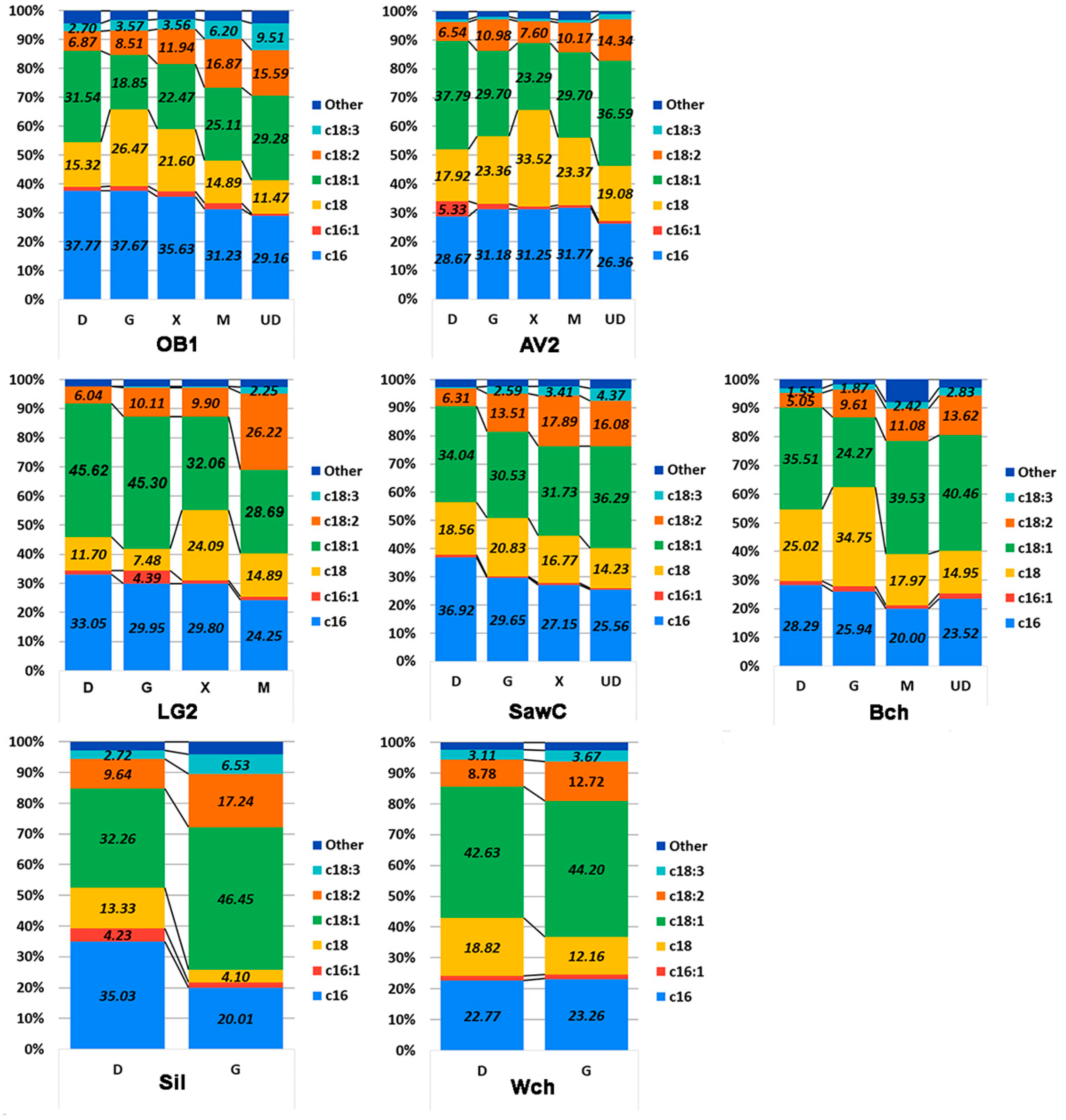 | C18:1 | 38–42 | 45.62 | 20–23 | 40.46 | 26–35 | 32.06 | 29.28 | 24.27 |