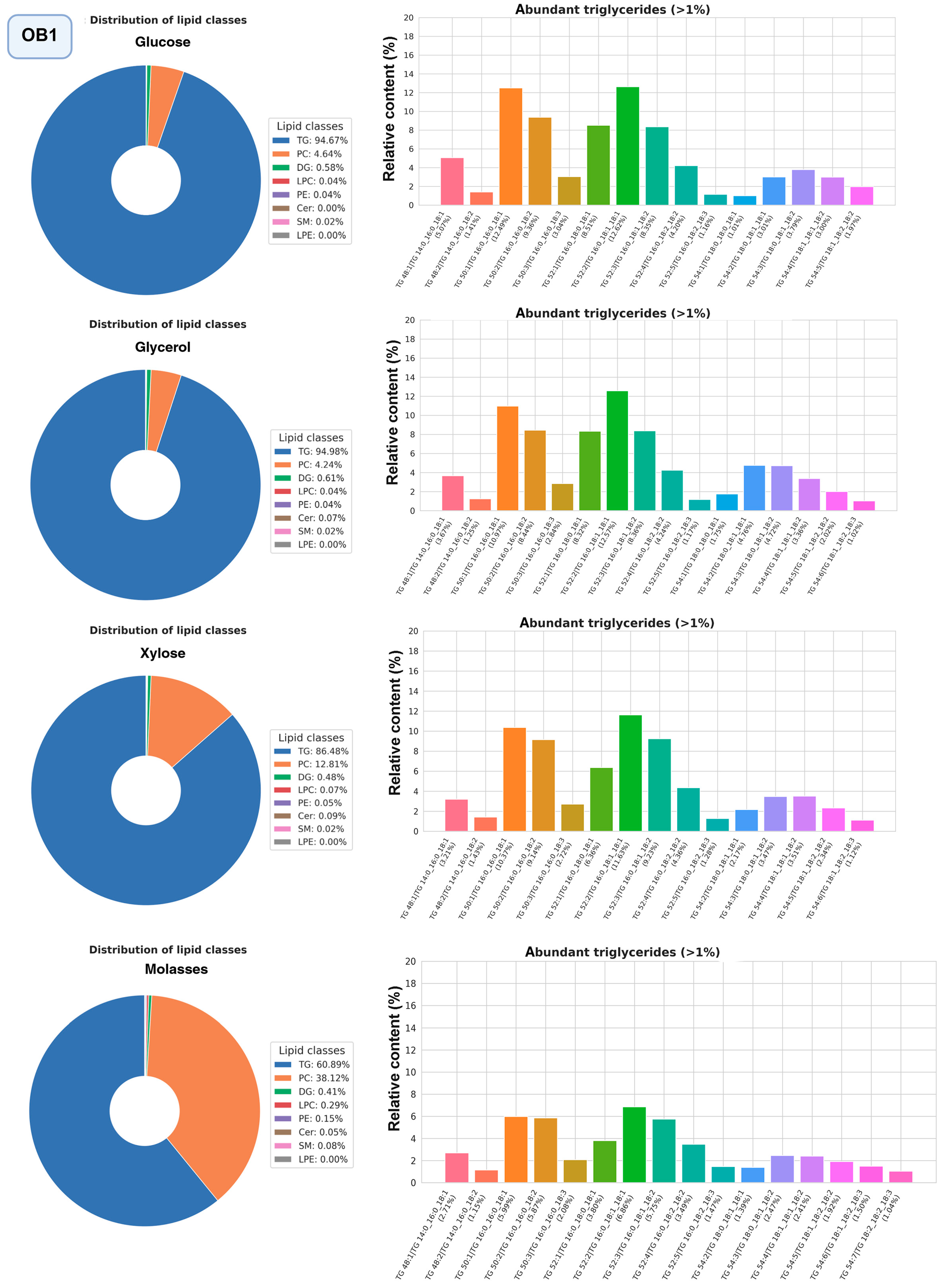 2.5. Lipidome Analysis of Oleogenic Strains Grown on Different Carbon Sources