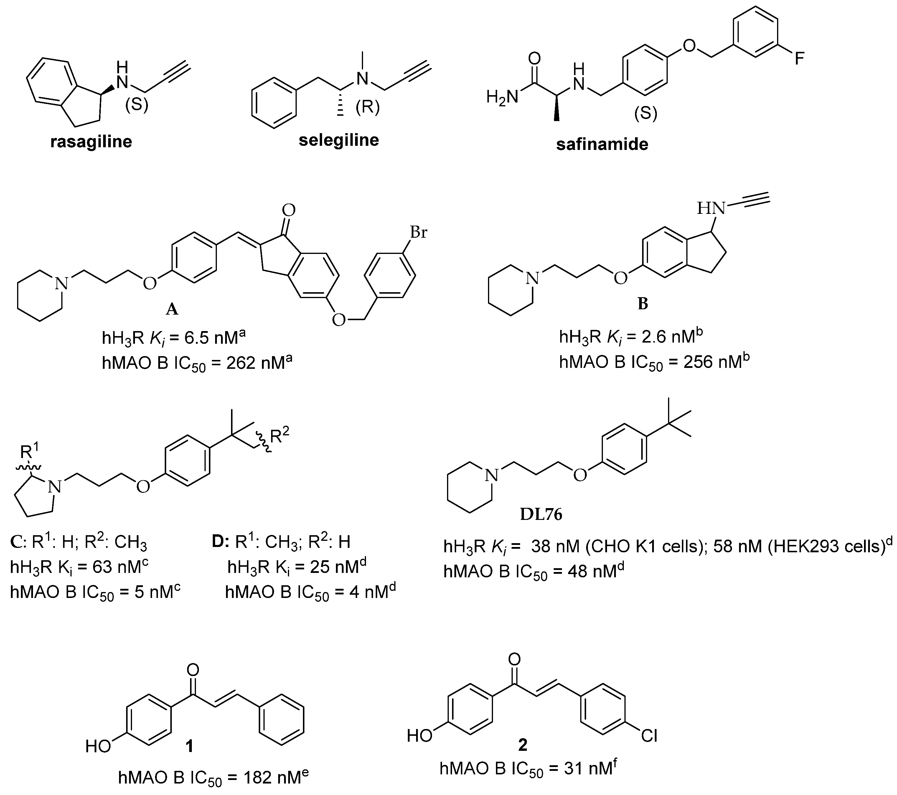 - Łażewska, D.; Siwek, A.; Olejarz-Maciej, A.; Doroz-Płonka, A.; Wiktorowska-Owczarek, A.; Jóźwiak-Bębenista, M.; Reiner-Link, D.; Frank, A.; Sromek-Trzaskowska, W.; Honkisz-Orzechowska, E.; et al. Dual Targeting Ligands-Histamine H3 Receptor Ligands with Monoamine Oxidase B Inhibitory Activity-In Vitro and In Vivo Evaluation. Pharmaceutics 2022, 14, 2187. [Google Scholar] [CrossRef] [PubMed]