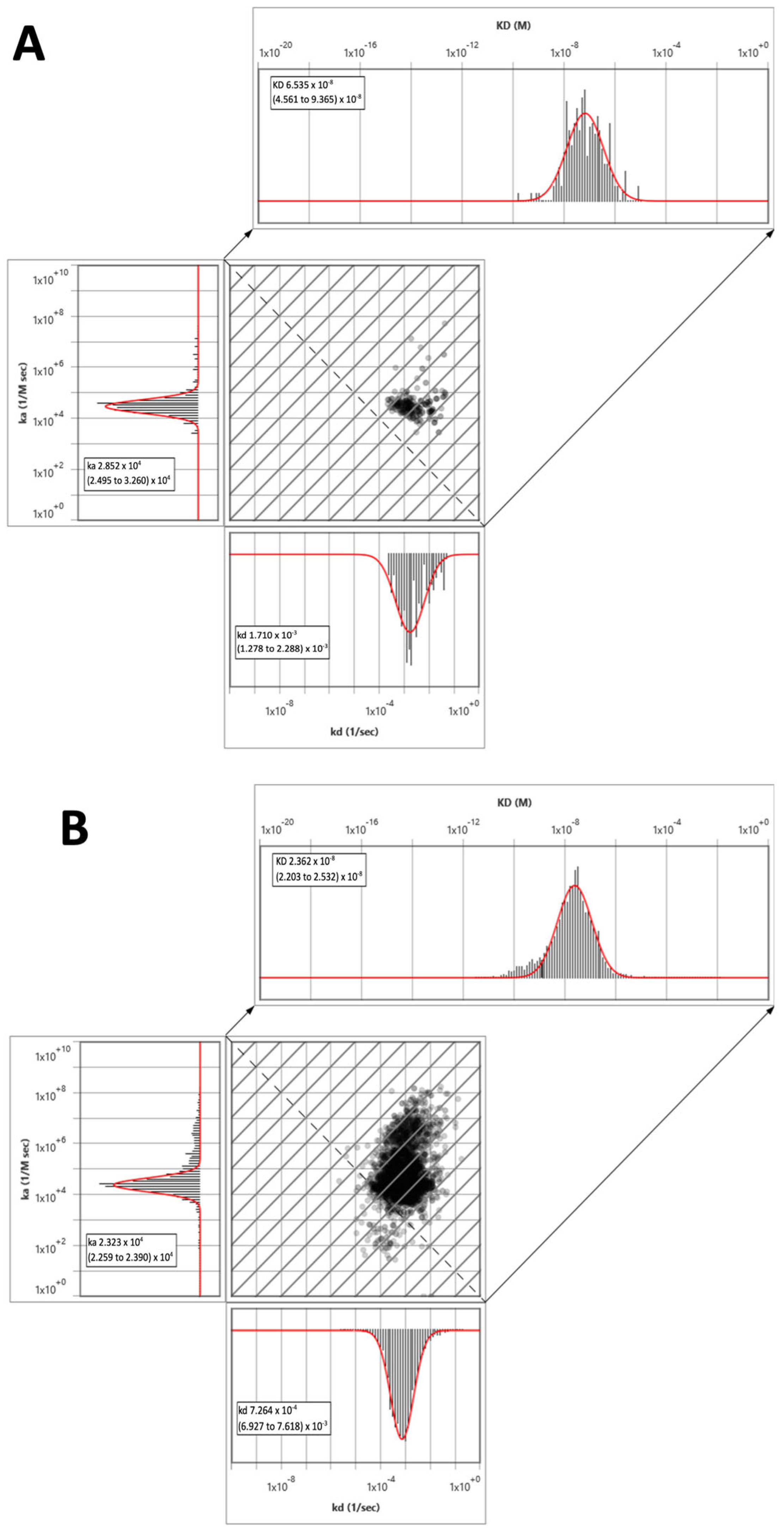 | KD a ± SEM [nM] | KD b ± SEM [nM] | ka c ± SEM [×104 M−1 s −1] | kd d ± SEM [×10−3 s −1] | RT e ± SEM [min] | |