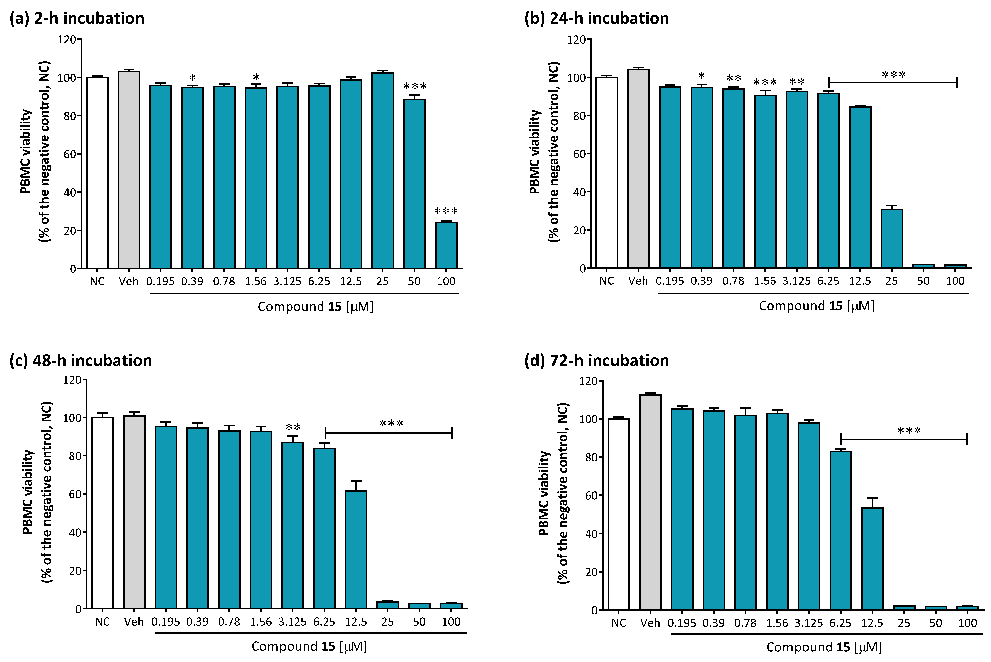 2.6.1. Effect of Compound 15 on Human Peripheral Blood Mononuclear Cell (PBMC) Viability