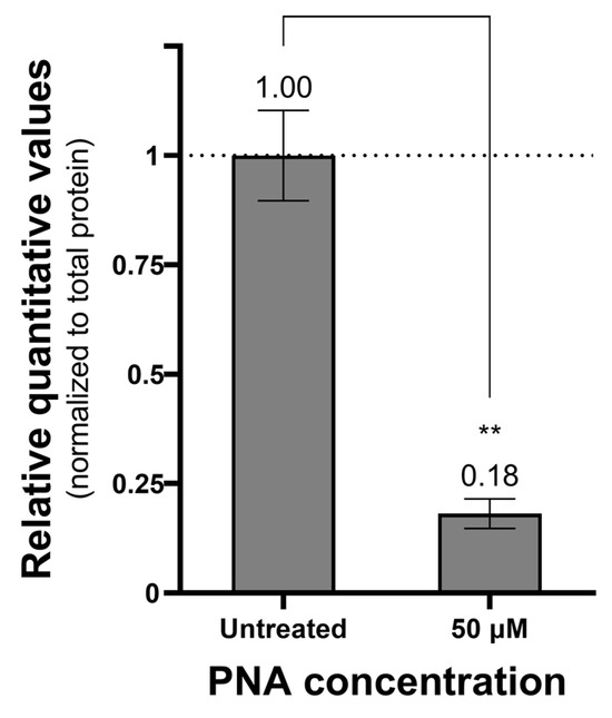 Gene expression analysis showed an approximately 95% reduction in protein levels, whereas quantitative real-time PCR revealed no significant changes at the mRNA level. This suggests that the PNA used in this study effectively suppresses gene expression primarily at the translational stage rather than at the transcriptional stage. This finding is consistent with previously reported results for a PNA targeting GyrA in E. coli [32]. PNAs generally act either by inducing mRNA degradation through RNaseH activation or by sterically blocking mRNA translation and processing. In bacteria, antisense targeting has predominantly been performed using PNAs and PMO oligomers, which do not activate RNaseH and are therefore known to exert their effects mainly through translational inhibition [33,34].