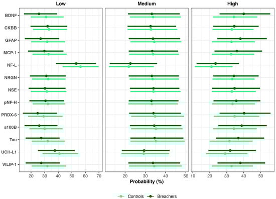 Posterior probabilities of biomarker concentration categories in Breachers and Controls. Bayesian posterior mean probabilities (points) and 90% credible intervals (bars) for low, medium, and high biomarker concentrations in Breachers (dark green) and Controls (light green).