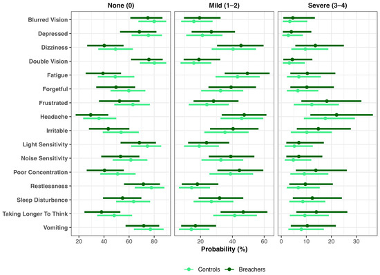 Distributional shifts in post-concussive symptoms by group. Bayesian ordinal models estimated the probability of endorsing None (0), Mild (1–2), or Severe (3–4) symptom levels for each Rivermead Post-Concussion Questionnaire (RPQ) item in Breachers and Controls. Points represent posterior means and horizontal bars denote 90% credible intervals.