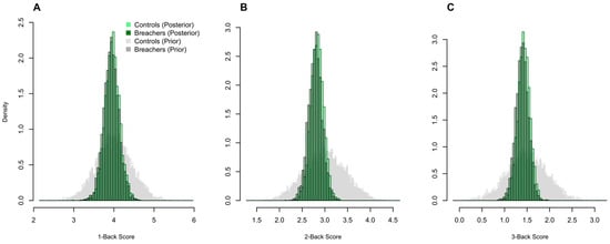 Working-memory performance does not differ between Breachers and Controls. Posterior histograms of N-Back sensitivity (d′) for 1-Back (A), 2-Back (B), and 3-Back (C) conditions show substantial overlap between Breachers and Controls, with no meaningful group differences in accuracy or sensitivity. Corresponding prior histograms overlaid in grey.