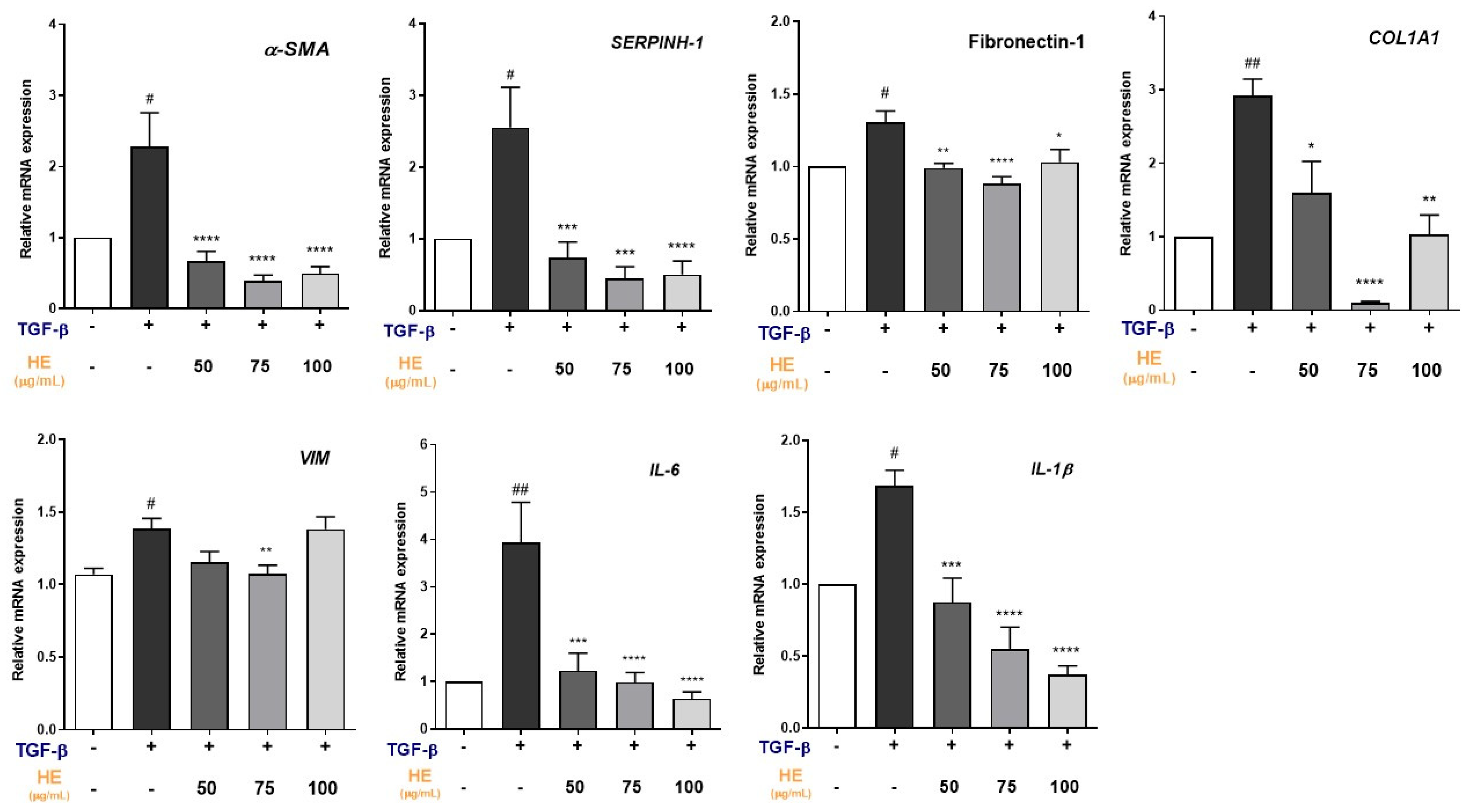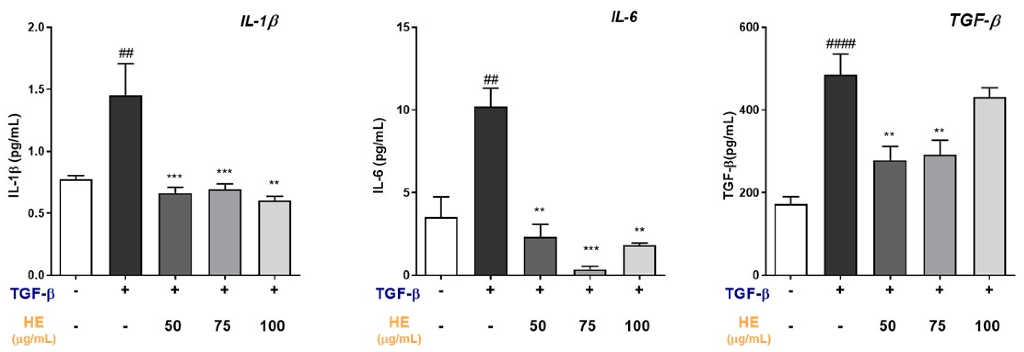 2.2. Effect of HE on TGF-β1-Induced Expression of Fibrosis and Inflammation-Related Genes
