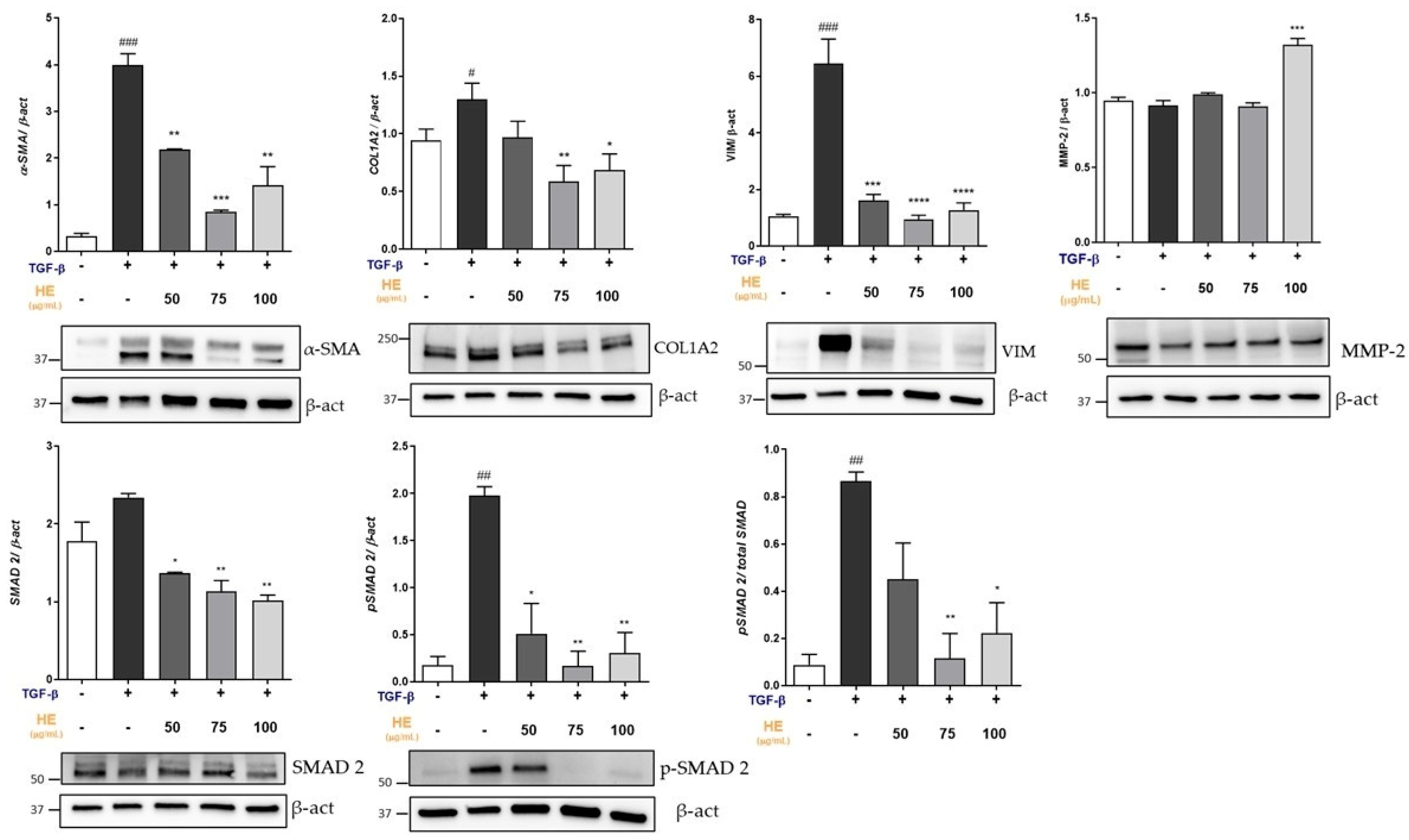 2.3. Effect of HE on Protein Expression of Key Mediators Involved in Fibrogenic Processes