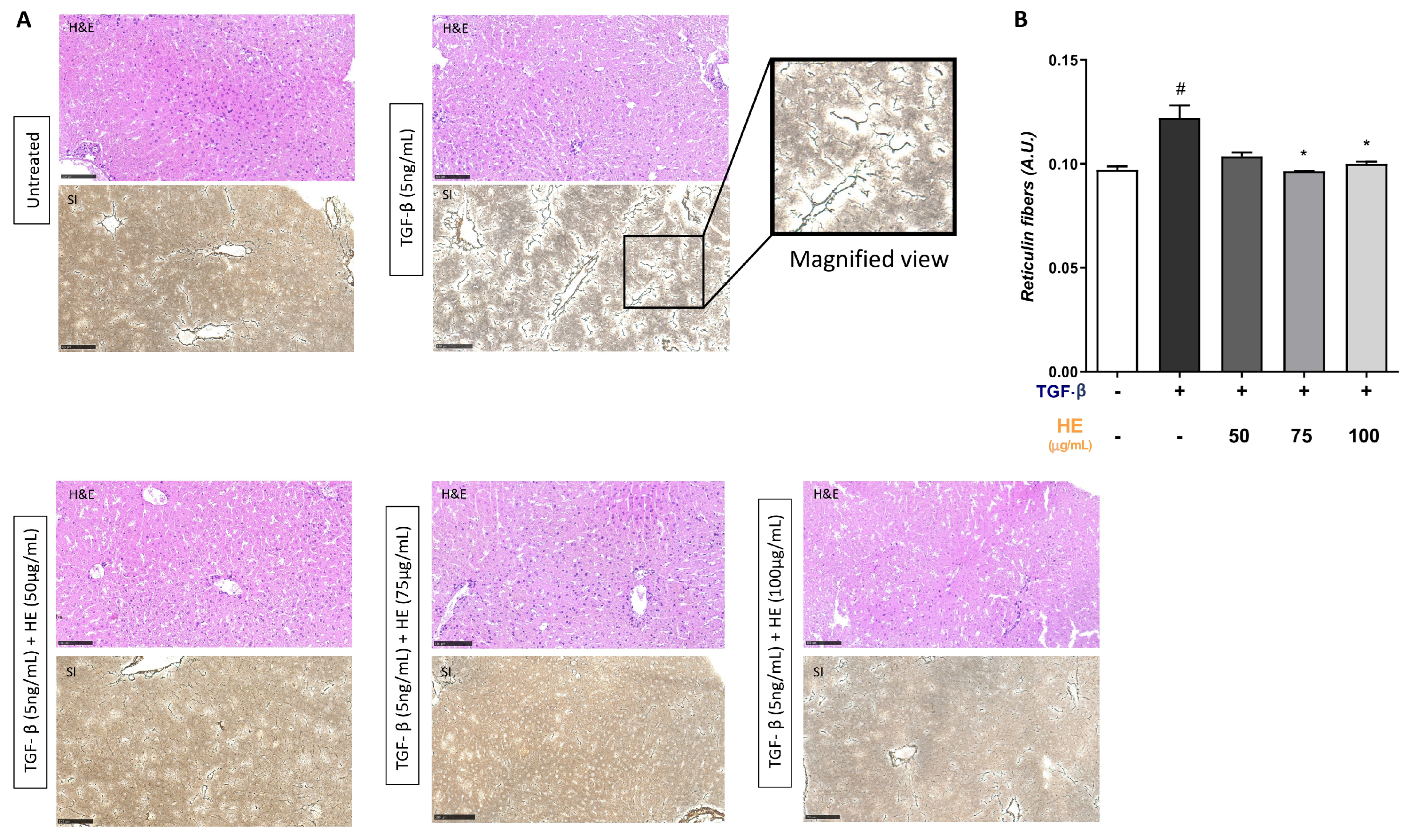 2.5. Protective Role of HE on TGF-β-Induced Liver Injury Assessed by H&E and Silver-Reticulin Impregnation Staining